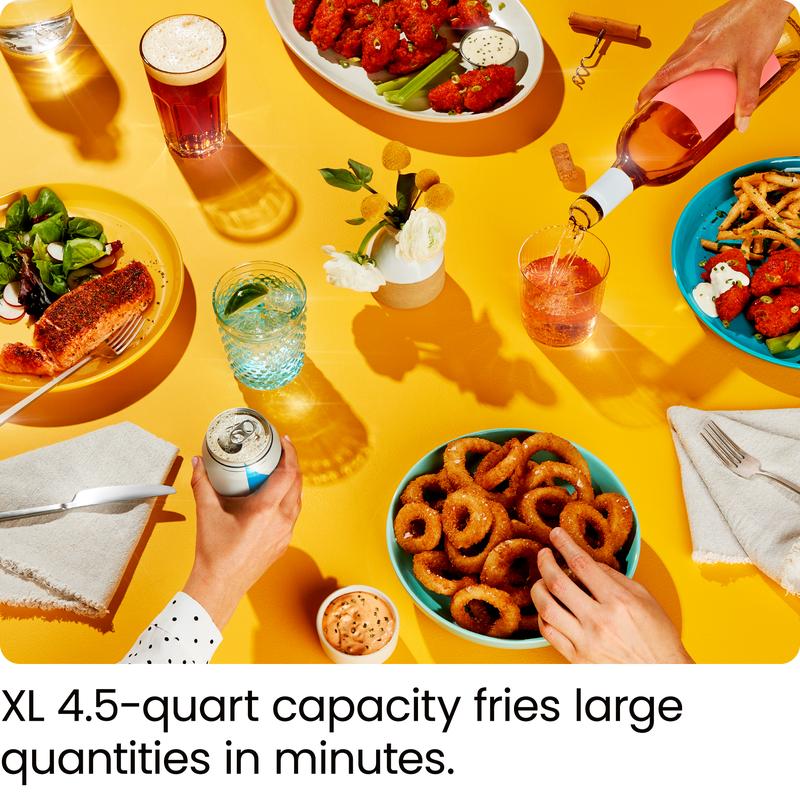 The large basket allows for frying a variety of pieces and the deep fryer basket is great. Also, the counter accessibility os is a great space saver. The ability to set timer for proper cook time.
