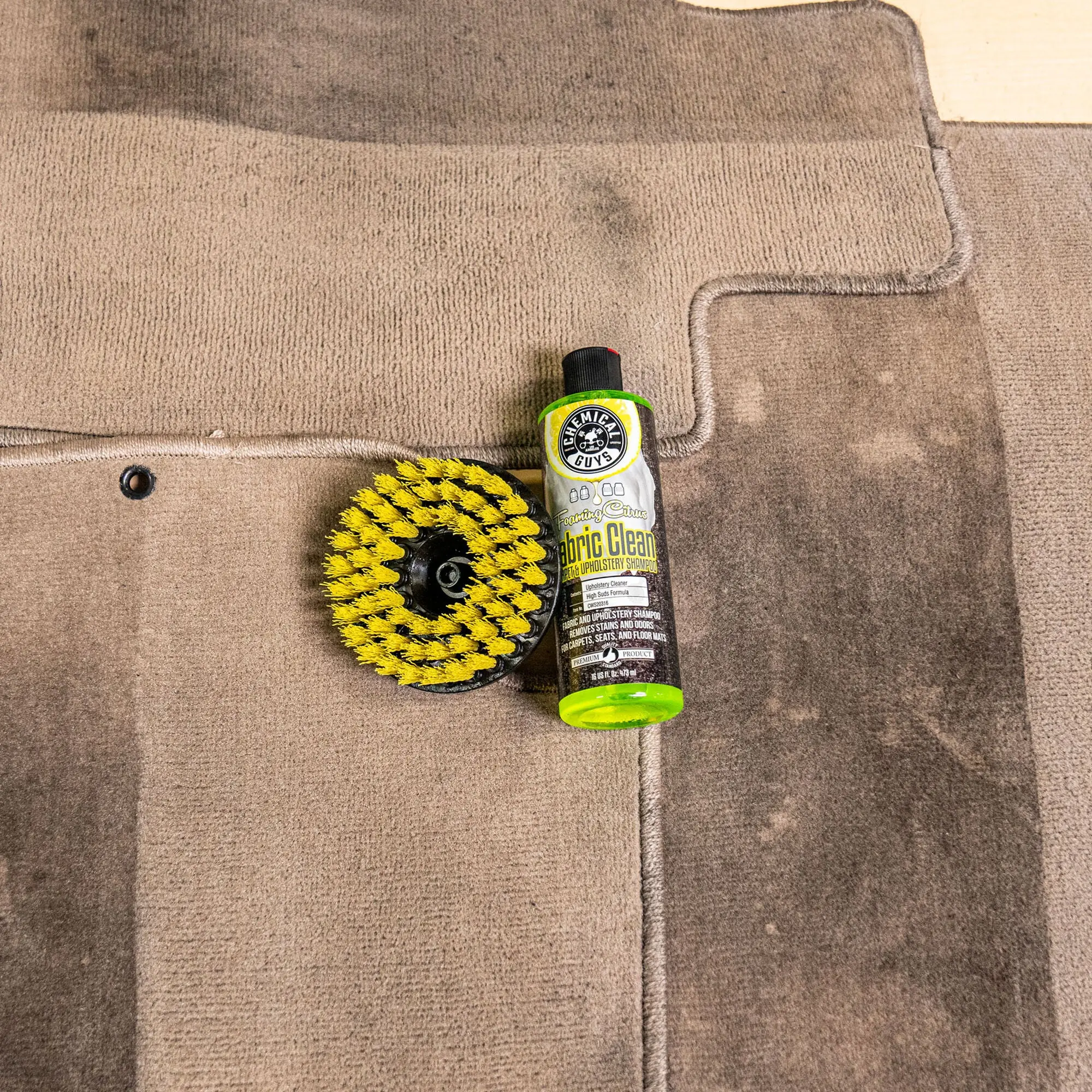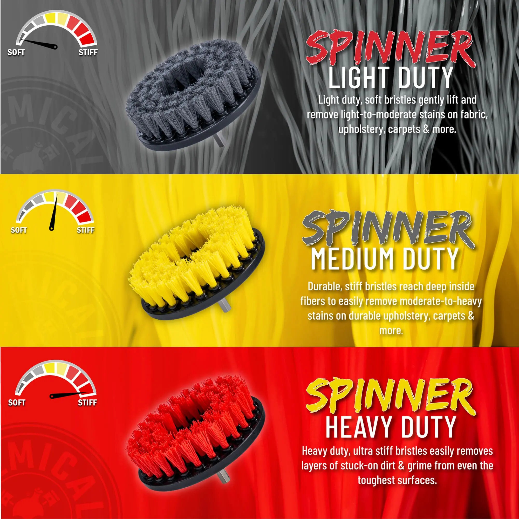 The Medium Duty Spinner Multi-Surface Drill Brush is the perfect tool to deep clean durable upholstery, carpets, seats, bathrooms, kitchens, and more in your car, office, garage, van, truck, RV, and home! The medium duty bristles are perfect for those moderate-to-heavy stains that just need a good scrub. Like a child trying to choose a bed, the Spinner Medium Duty isn’t too hard, and isn’t too soft, but just right for those durable carpets, seats, and floor mats in your car, home, or office! If you’ve got a heavy stain in need of fast removal, the Spinner Multi-Surface Drill Brush Medium Duty is the tool for the job!