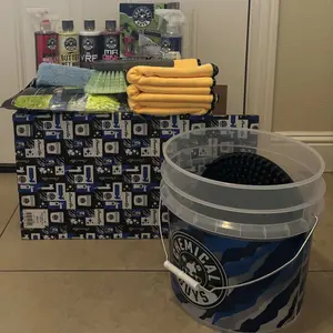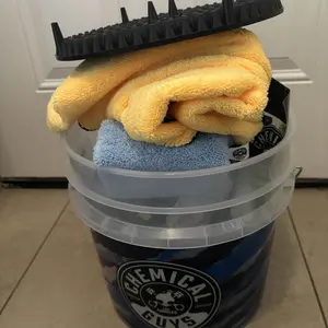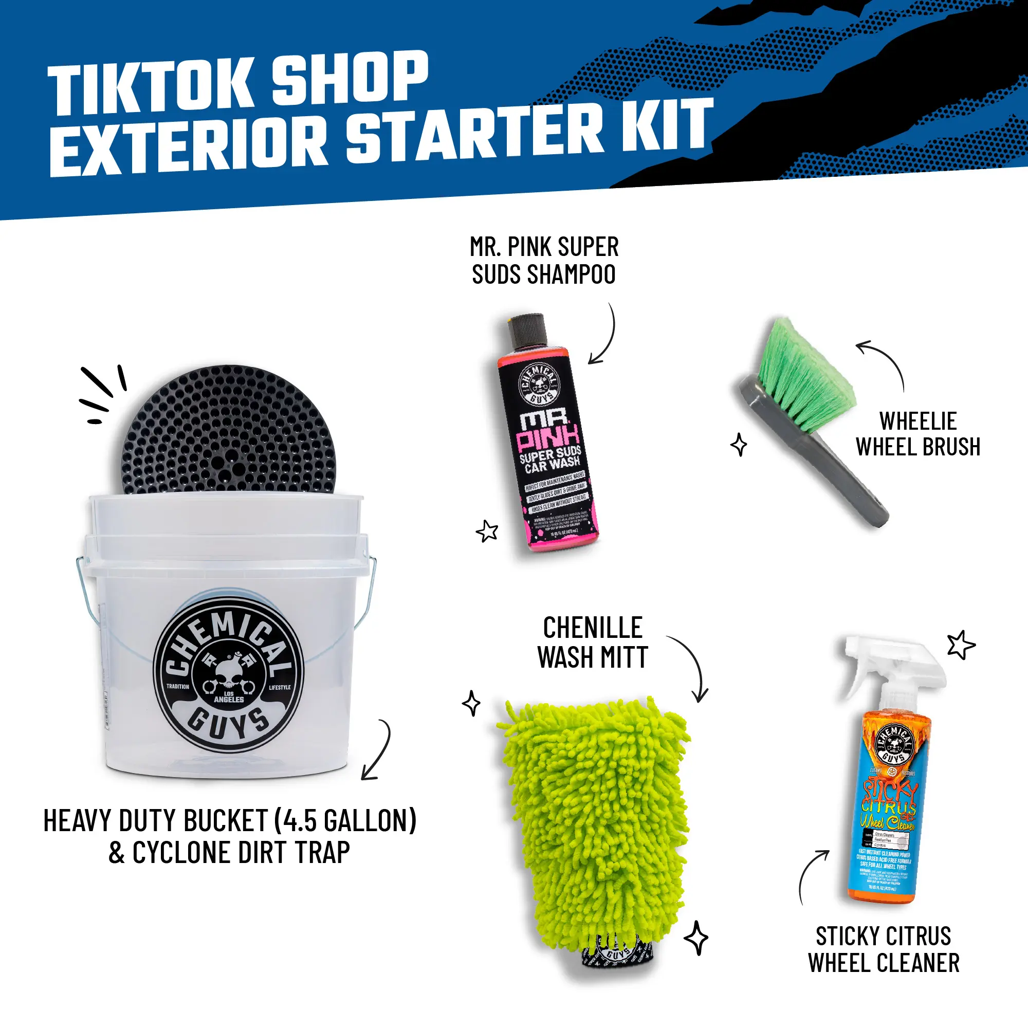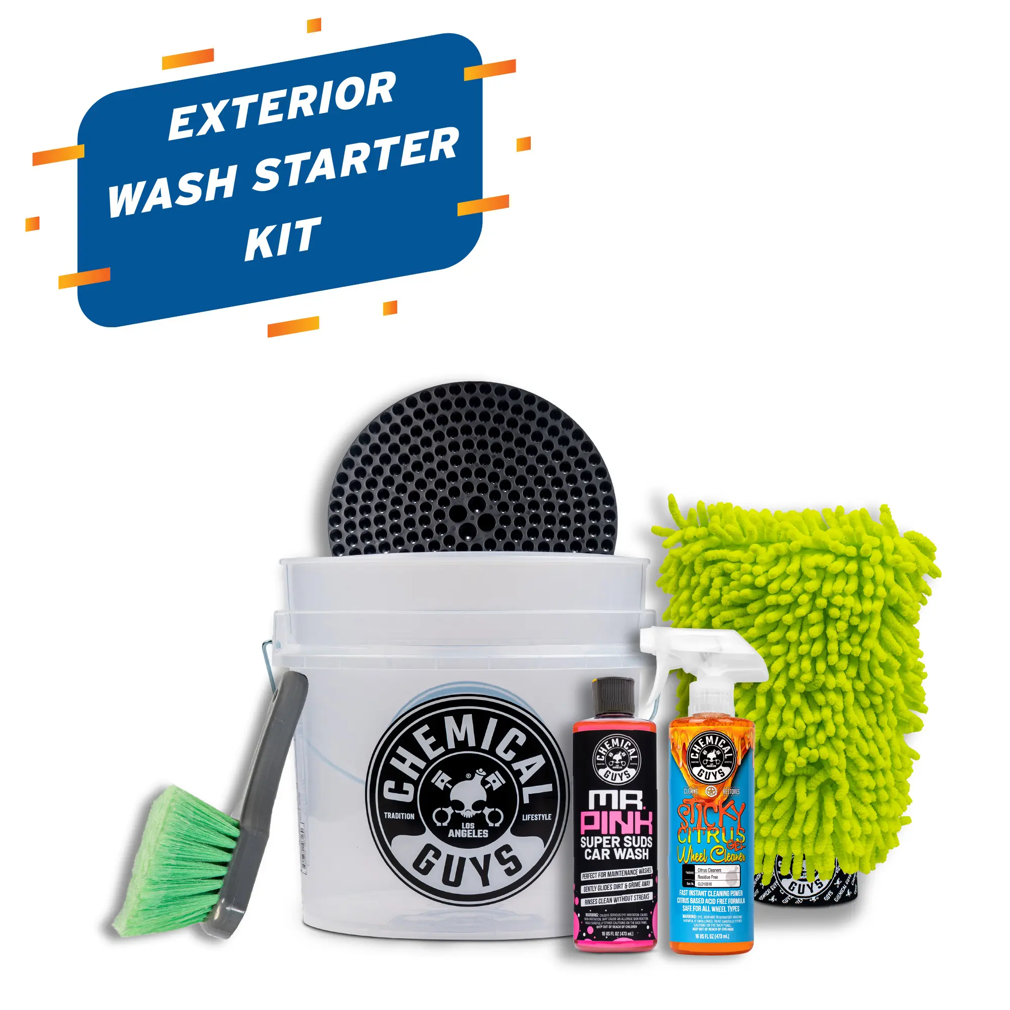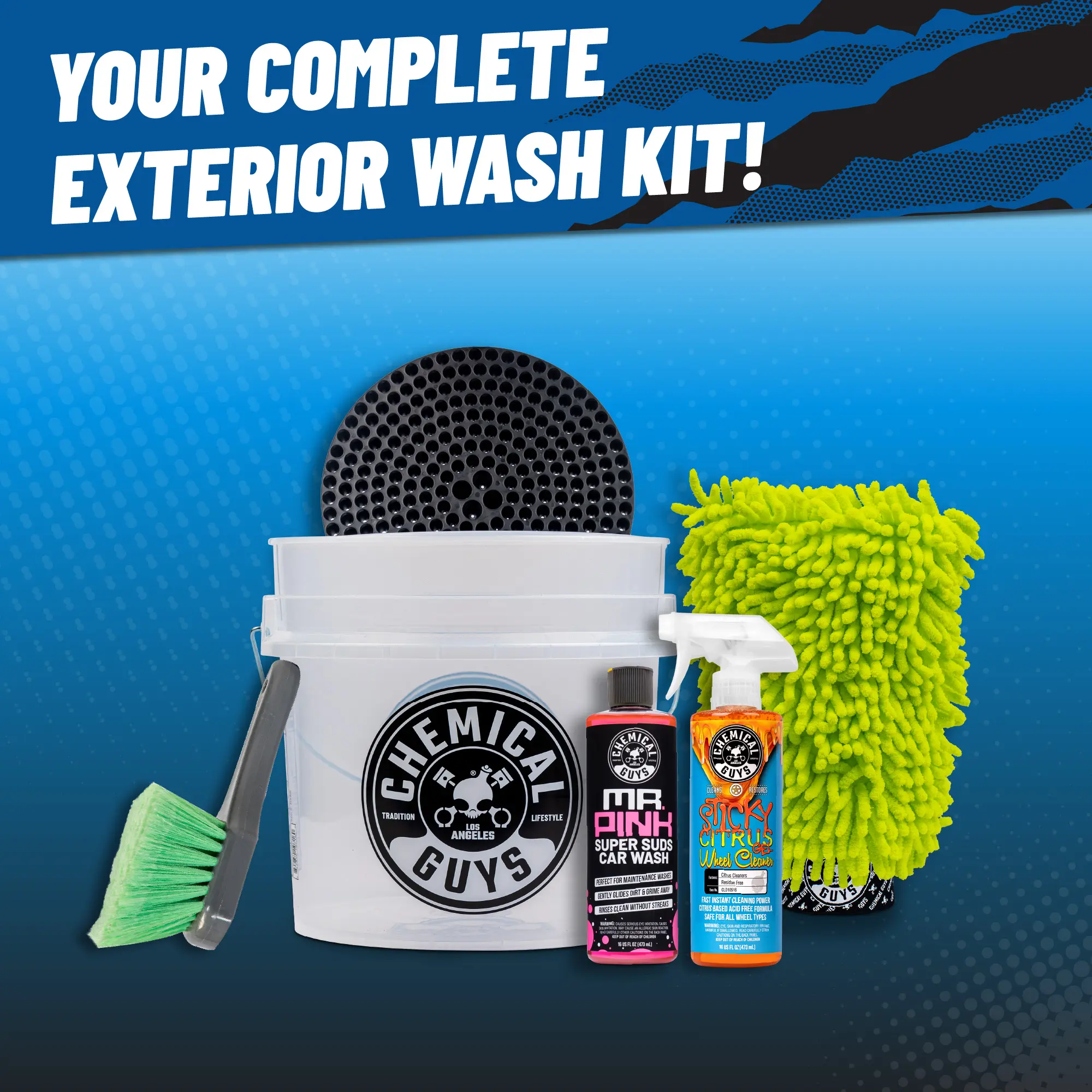 ·Clean Exterior Starter Kit: Mr Pink Car Soap (16oz), Sticky Citrus Wheel Cleaner (16oz), Wheelie Brush (1), Heavy Duty Detailing Bucket (1), Dirt Trap (1), Chenille Wash Mitt (1)