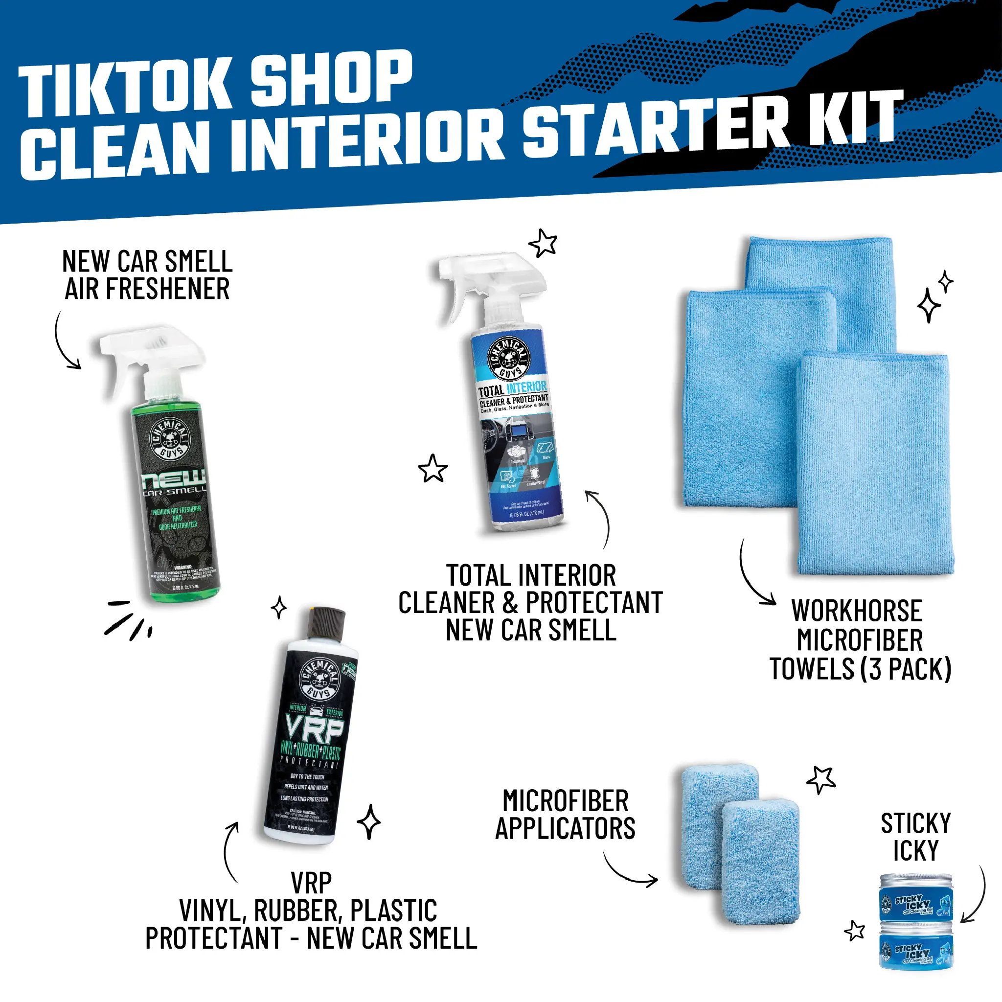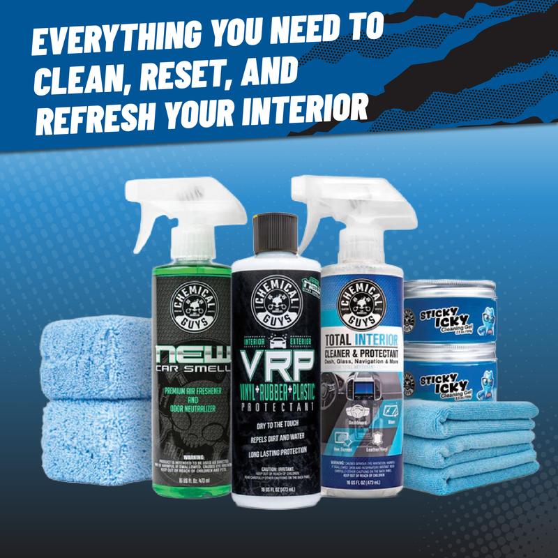 ·Clean Interior Starter Kit: Total Interior (16oz), VRP New Car Scent (16oz), New Car Scent Air Freshener (16oz), Sticky Icky Car Cleaning Gel (2), Microfiber Applicators (2), Microfiber Towels (3)