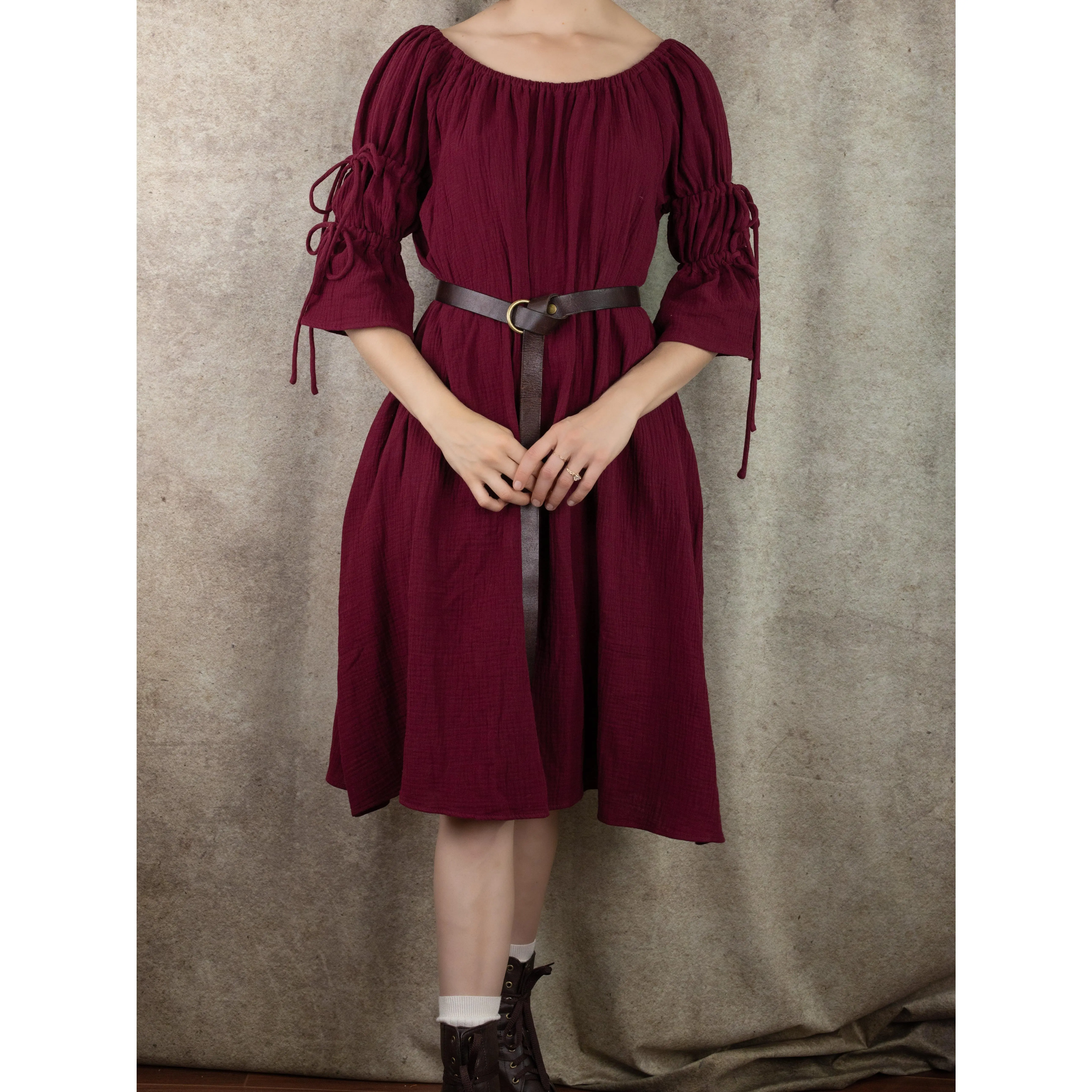 A timeless and ever-flattering classic, our Red Cotton Puff Sleeve Chemise makes the perfect dress to wear on it's own, under a corset, or accessorized with your favorite renaissance faire accessories. This dress is made from super soft 100% textured cotton fabric, featuring puff sleeves and an optional on or off the shoulder silhouette. Adjustable ties below the elbow create two voluminous puffs in the sleeves, and an elastic neckline keeps our chemise snug and fitted around your shoulders and arms.