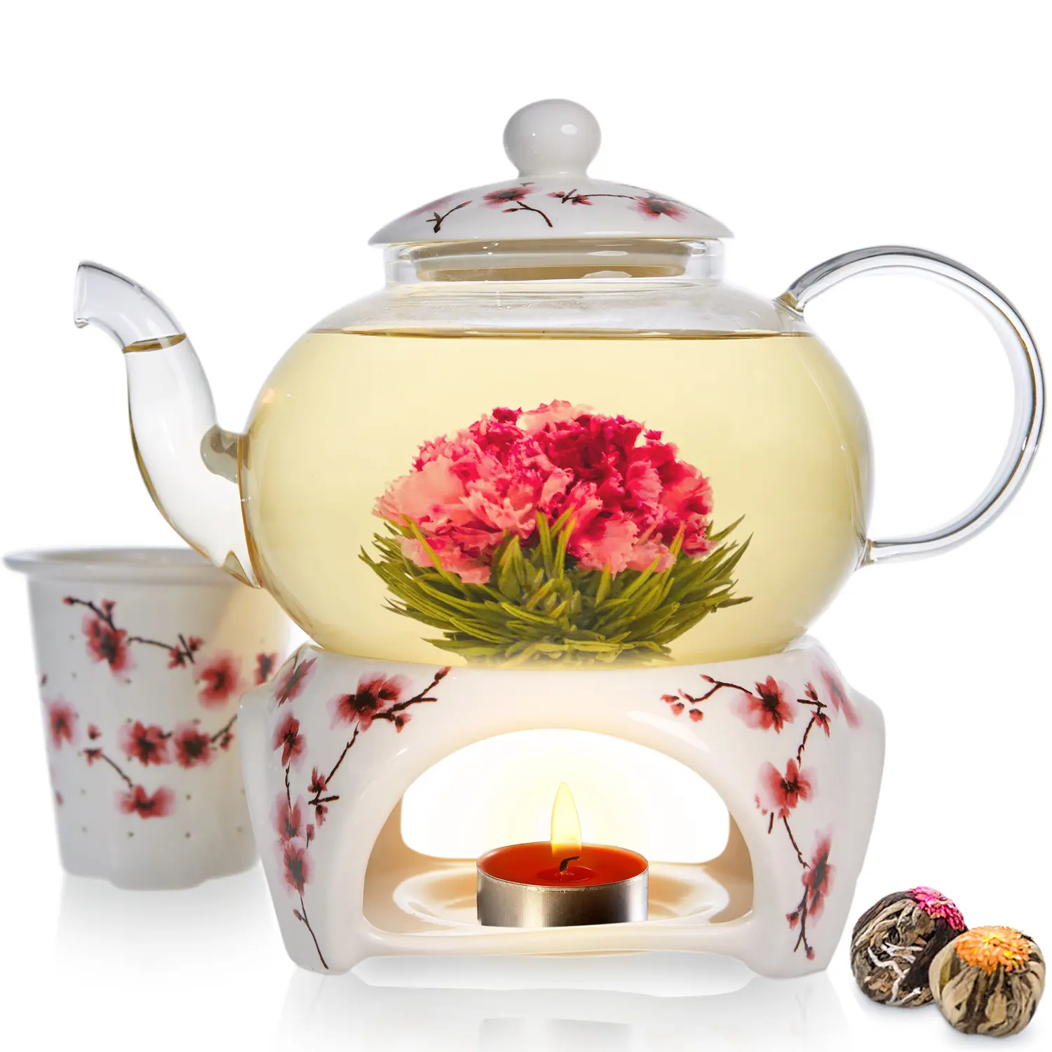 Restore your serenity with Teabloom’s new Cherry Blossom tea set, thoughtfully designed for a grace-ful sensory experience. Porcelain accents are hand-painted with delicate cherry blossoms, symbolizing the beauty of life. The main teapot body is crystal-clear, durable borosilicate glass that perfectly spotlights the drama of flowering tea. Add a tealight candle to keep your tea the perfect temperature. It’s a recipe for peaceful, restorative moments.