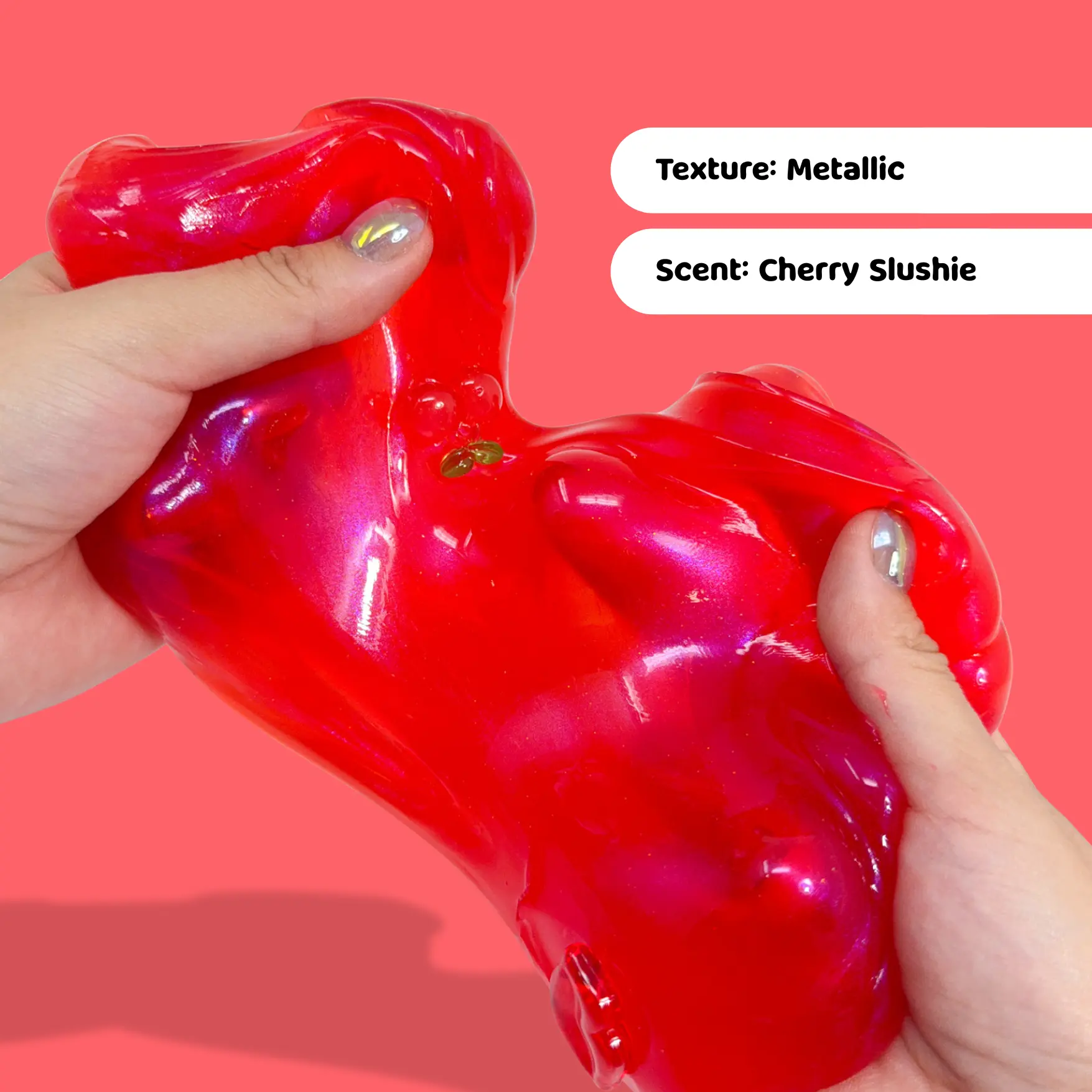 Texture: This slime features a mesmerizing metallic base with the cutest cherry themed charms! The beautiful thick slime base is amazing for clicks and bubble pops.