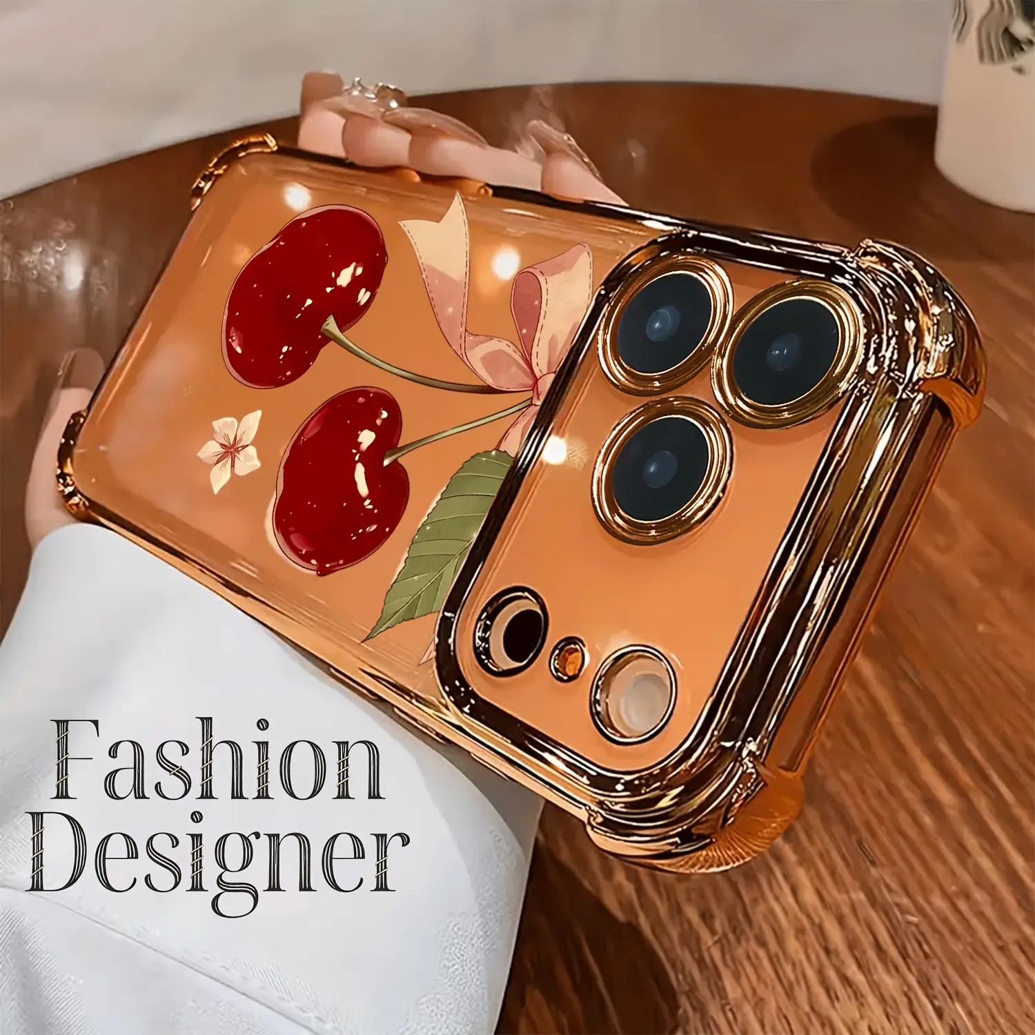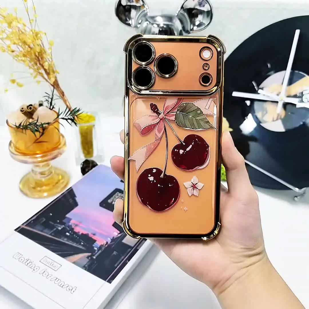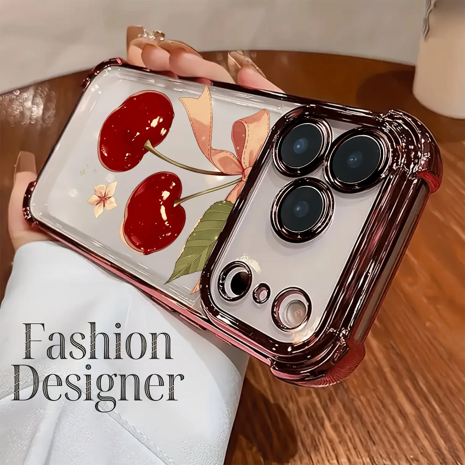 Cherry floral bow pattern Four-corner Thickened Mobile Phone Case for iPhone 17 Air 16 15 14 13 12 11 Pro Max Plus border Electroplating with counter-fall Safety Cushion 2D printing Protective Smartphone