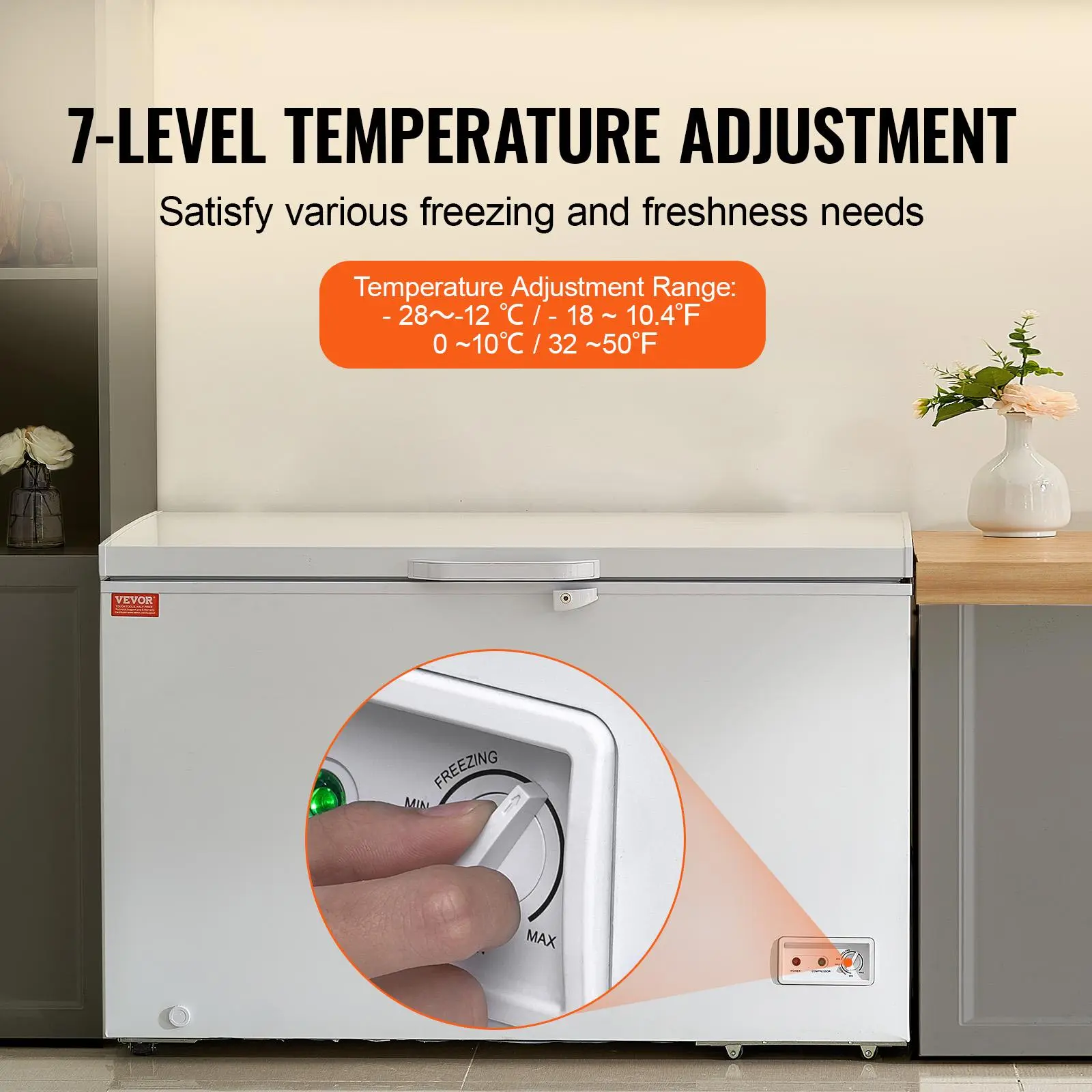 • Deep Freezer with Adjustable Thermostat: Our deep chest freezer offers customizable temperature control through a convenient temperature control knob. With 7 temperature settings ranging from -28 to -12°C (-18.4 to 10.4℉) and 0 to 10°C (32 to 50℉), you can select the perfect temperature to suit your different food storage needs.