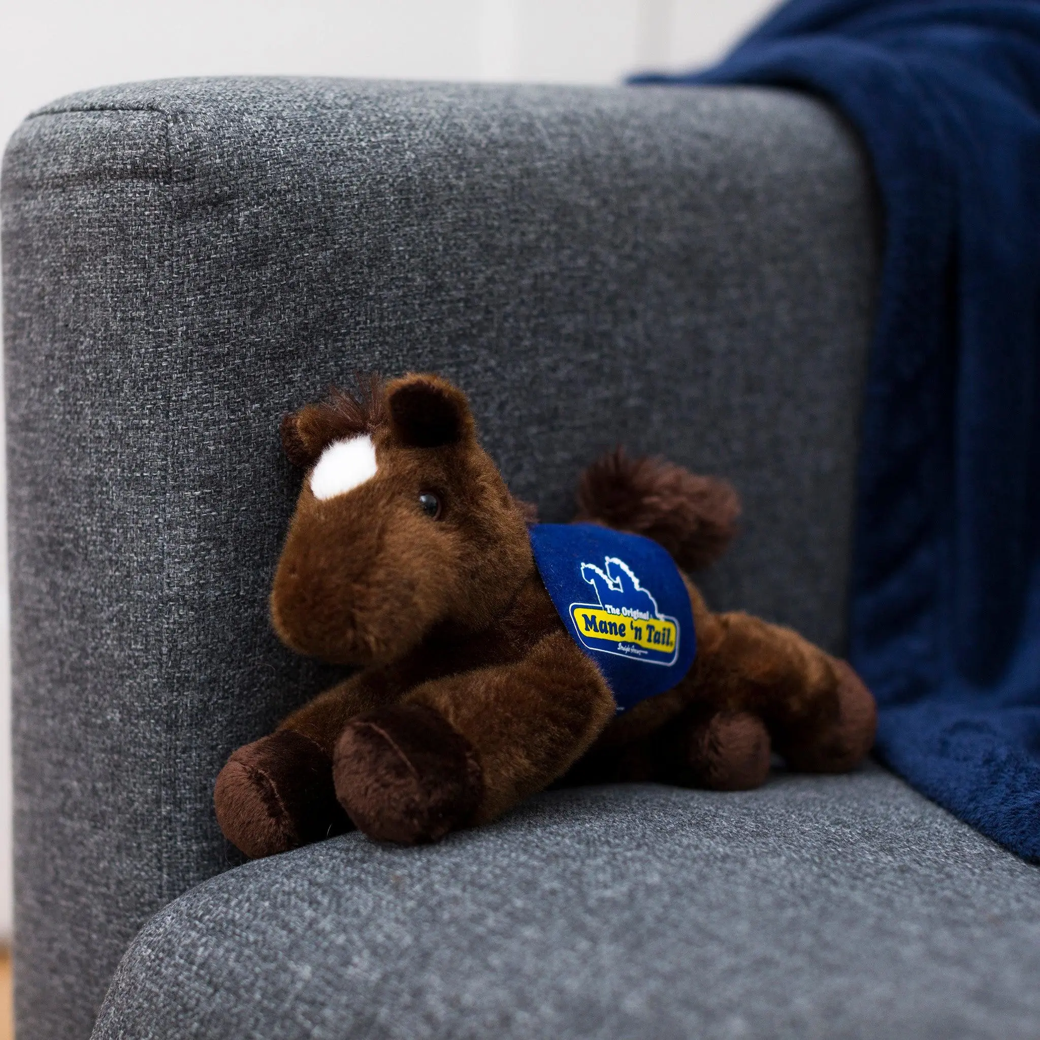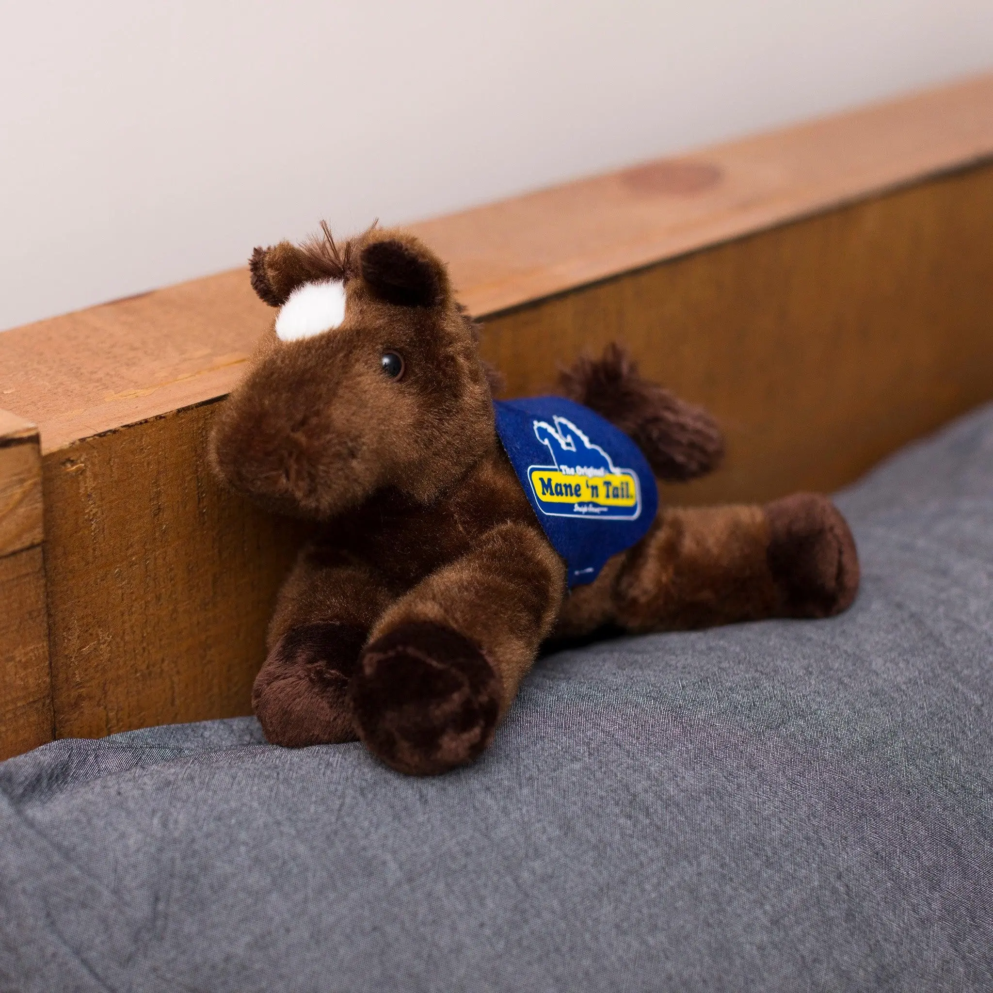 Soft 8" chestnut horse plushie with white marking on face. Perfect companion for any horse fan. Made of new materials containing polyester fibers and plastic pellets. Surface washable.