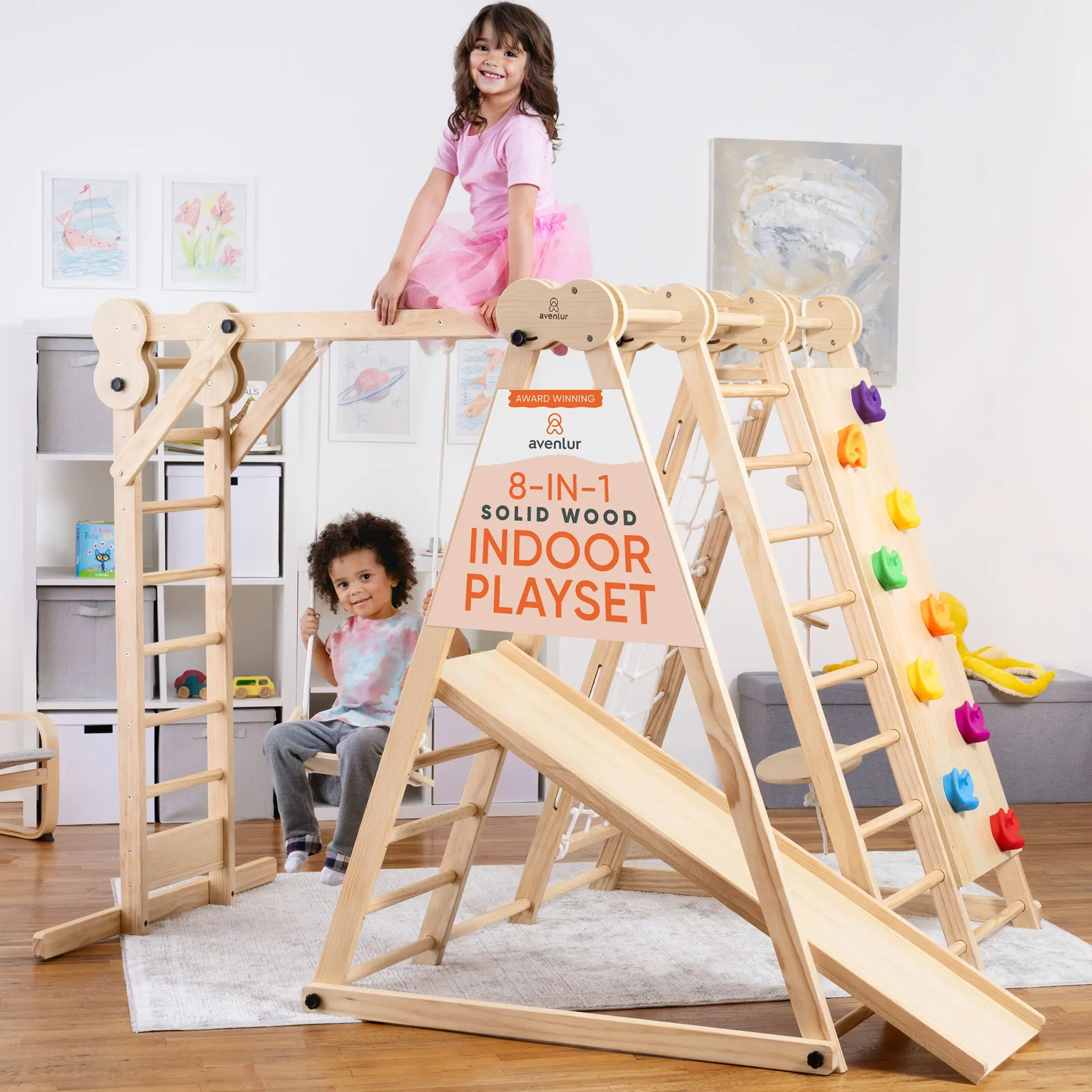 Avenlur’s Chestnut 8-in-1 Indoor Jungle Gym doubles as a play gym for toddlers and a growth-focused activity center for older children, adapting to their developmental needs as they age.