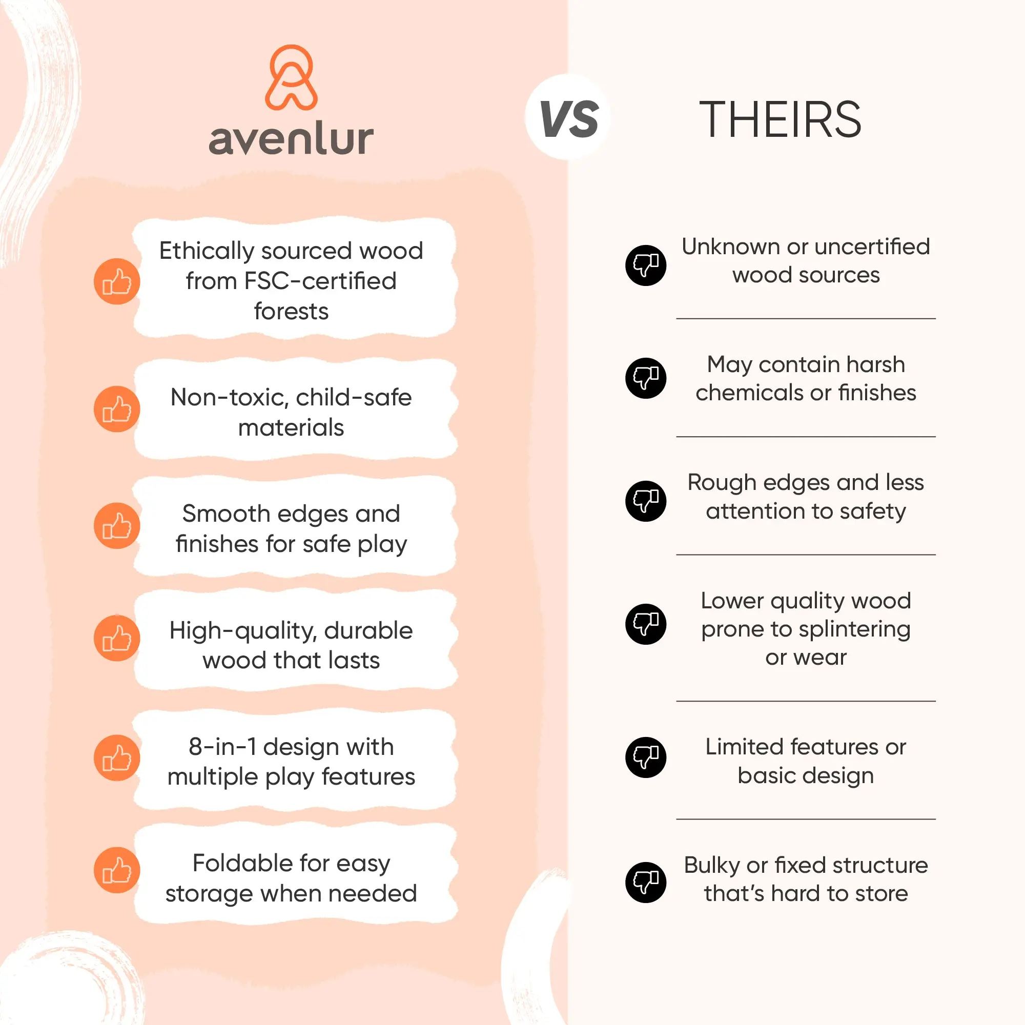 🌳 Durable, non-toxic wood - Built from strong, eco-friendly materials, Avenlur’s jungle gym provides a safe wood jungle gym experience for toddlers and young kids.