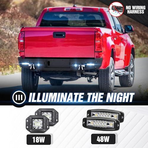 ·【Brighten Your Path】EYOUHZ Colorado/Canyon rear bumper includes two 18W square and two 18W horizontal LED spotlights that provide focused, bright illumination for improved visibility during nighttime driving, off-road recovery, and precise backing. Durable and weather-resistant, they ensure reliable performance in tough conditions.