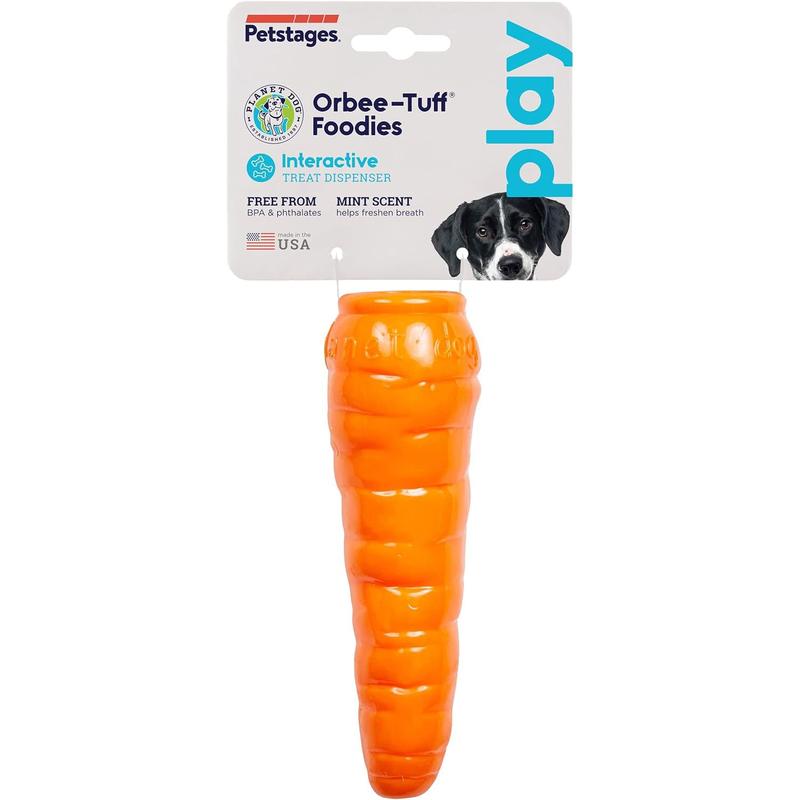 Outward Hound Orbee Tuff Carrot—This chew toy provides nutritious wags and is perfect for most-sized dogs because of its tapered shape. Orbee Tuff Carrot features a treat spot at the end, which is great for stuffing with treats for fun, interactive, or solo play. Orbee-Tuff Carrot bounces and floats, so it's perfect for water and land activities!