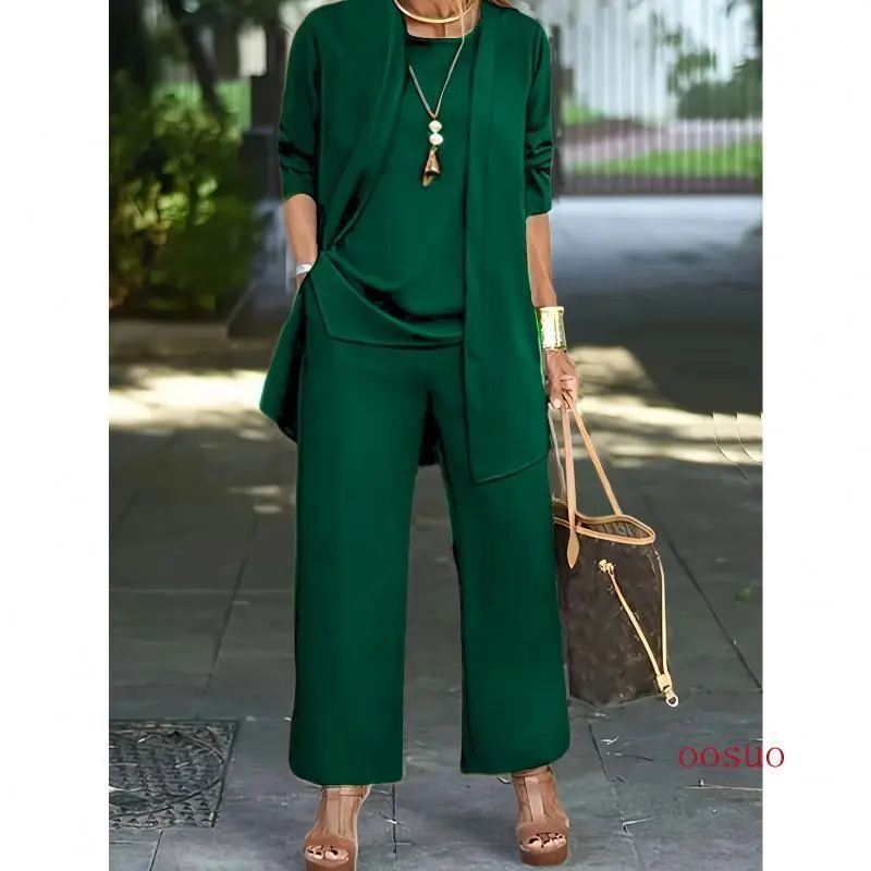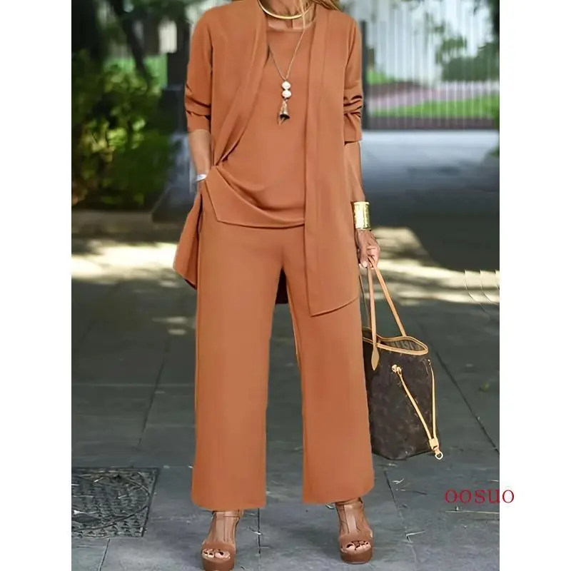 Chic Solid Three-Piece Outfit Set ? Elevate your everyday style with this chic three-piece outfit set. It includes a comfy long sleeve cardigan, a versatile top, and sleek pants. Perfect for women's casual wear, this set offers a blend of comfort and versatility. Ideal for everyday use, it's a must-have for your wardrobe. ?? Versatility and Comfort This outfit set is designed for comfort and versatility. The long top and sheer material add a touch of style. Perfect for casual outings, it's a versatile choice for women. ??