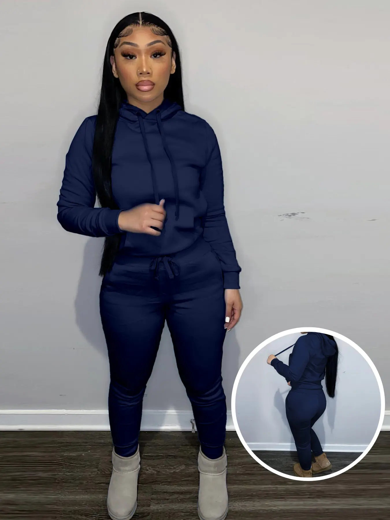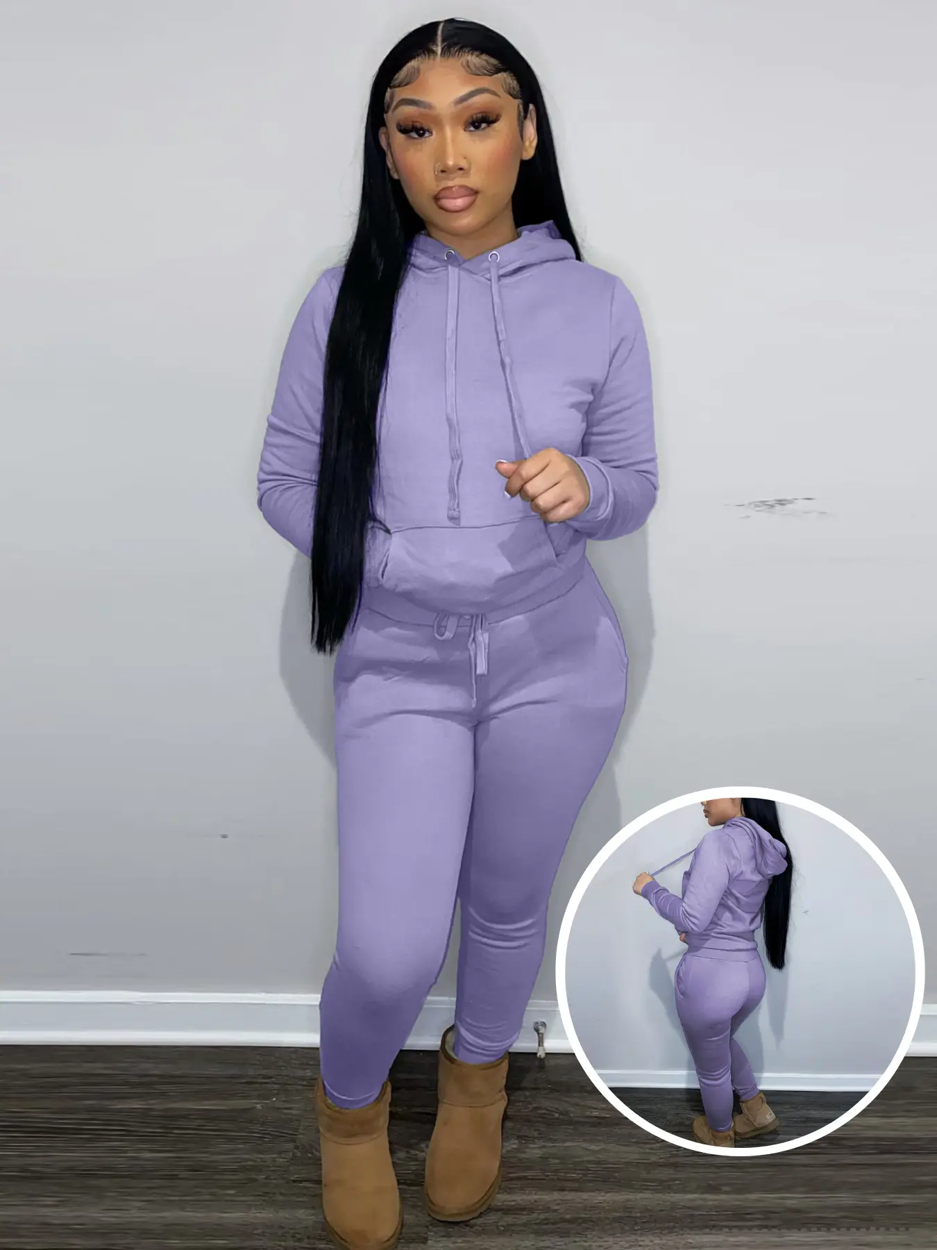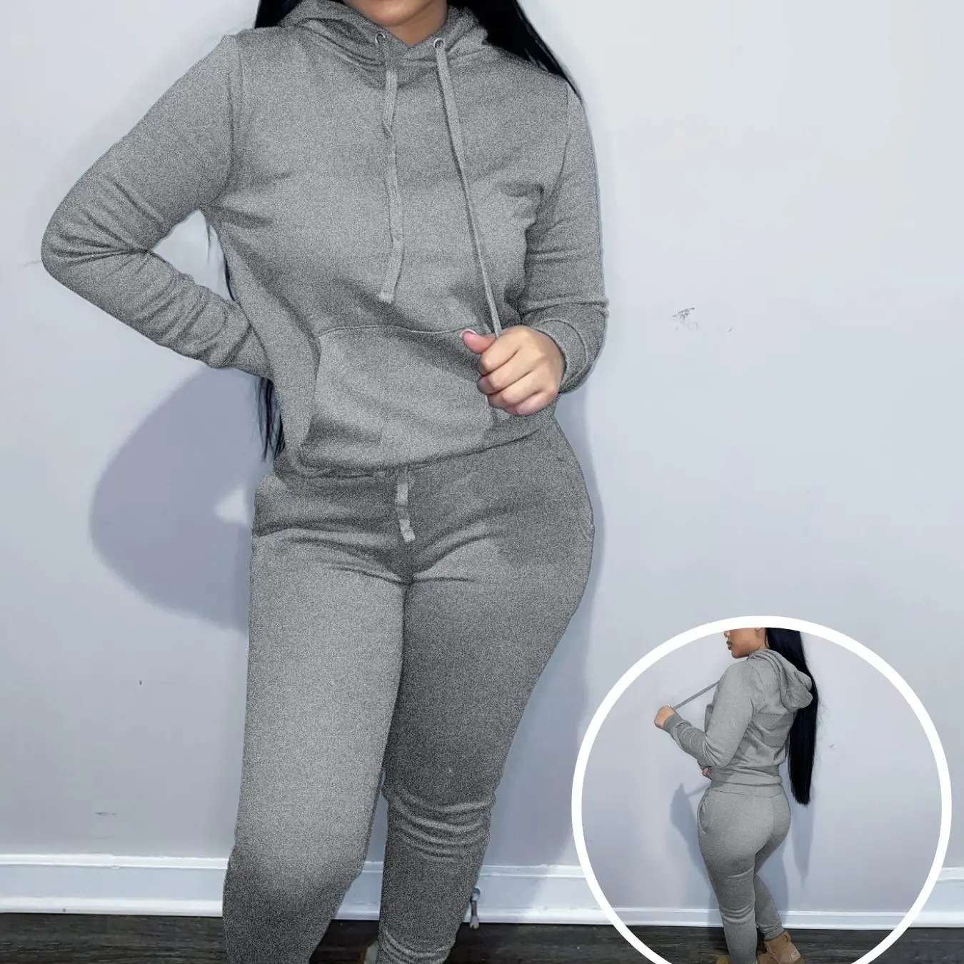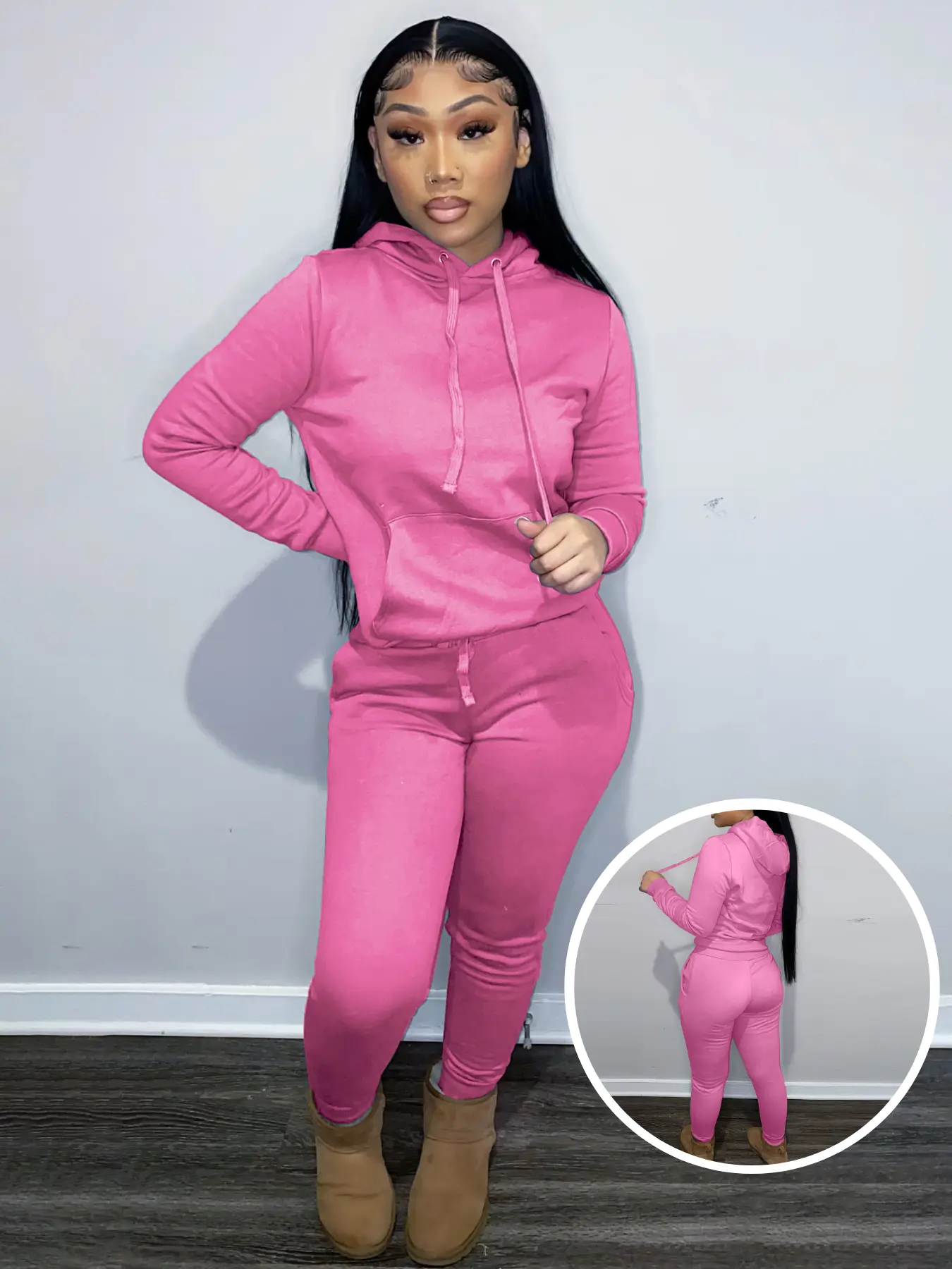 USBoutique Chic Women's Solid Drawstring Hoodie & Pocket Sweatpants Two-piece Set
