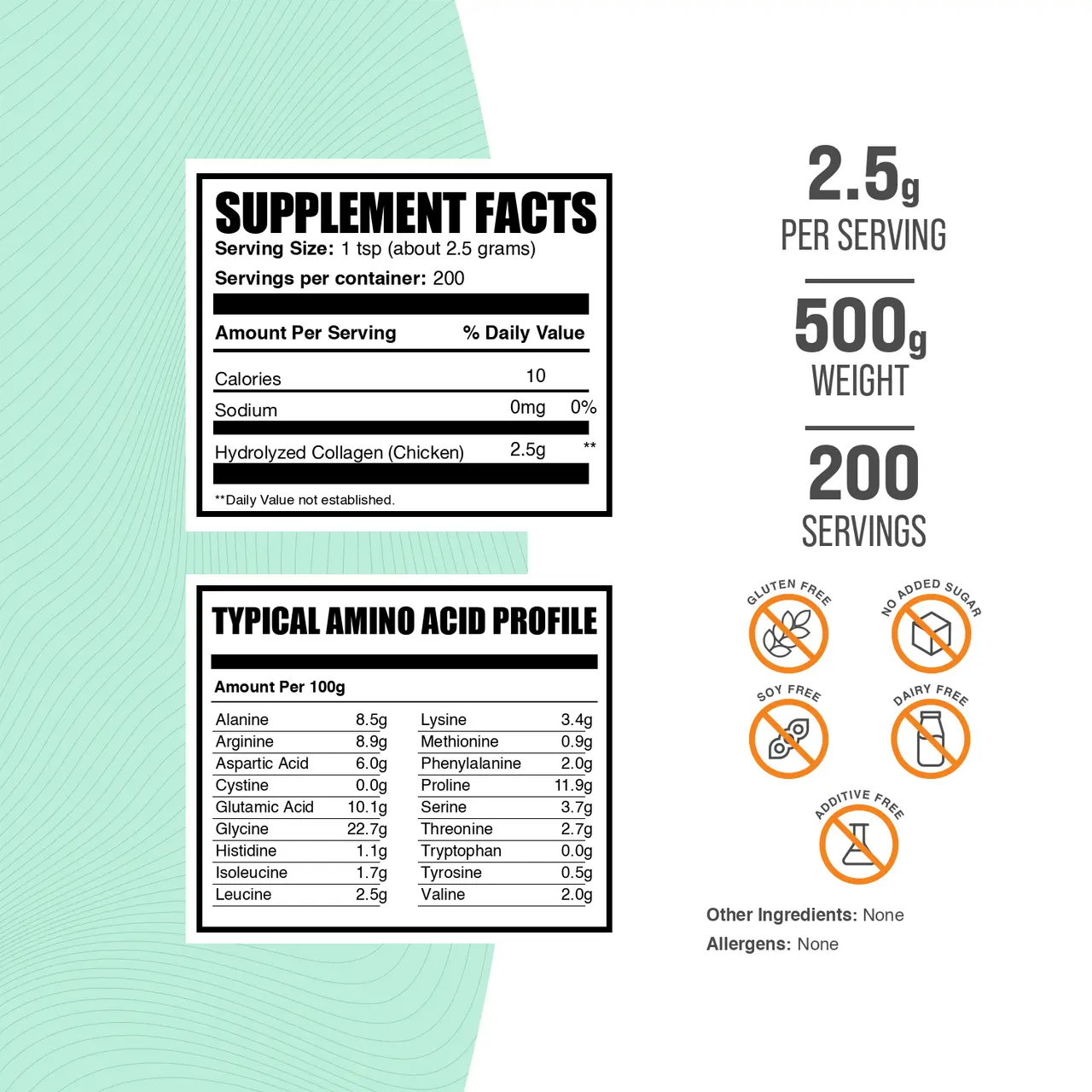 Free of: Gluten, Added Sugar, Soy, Dairy, Additives