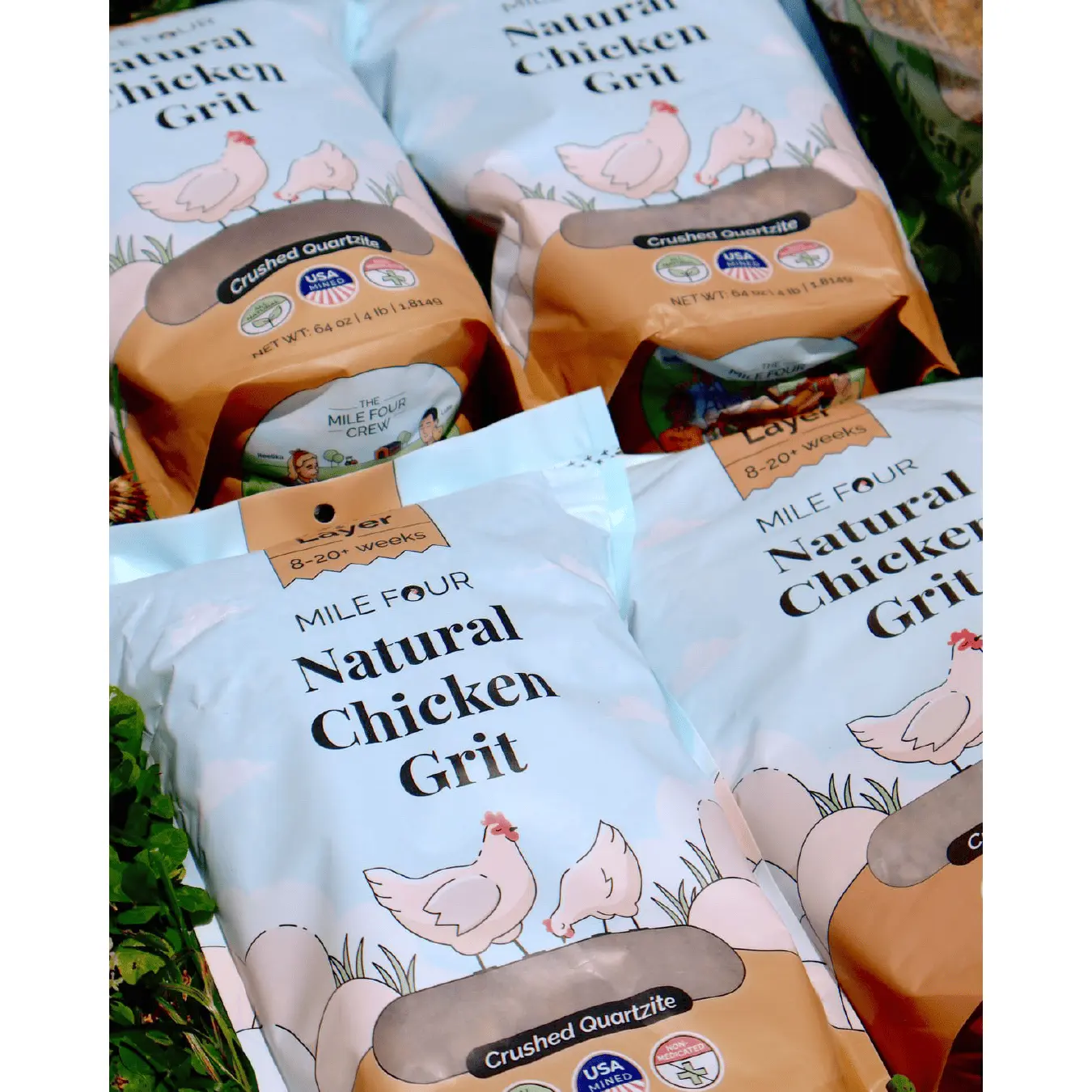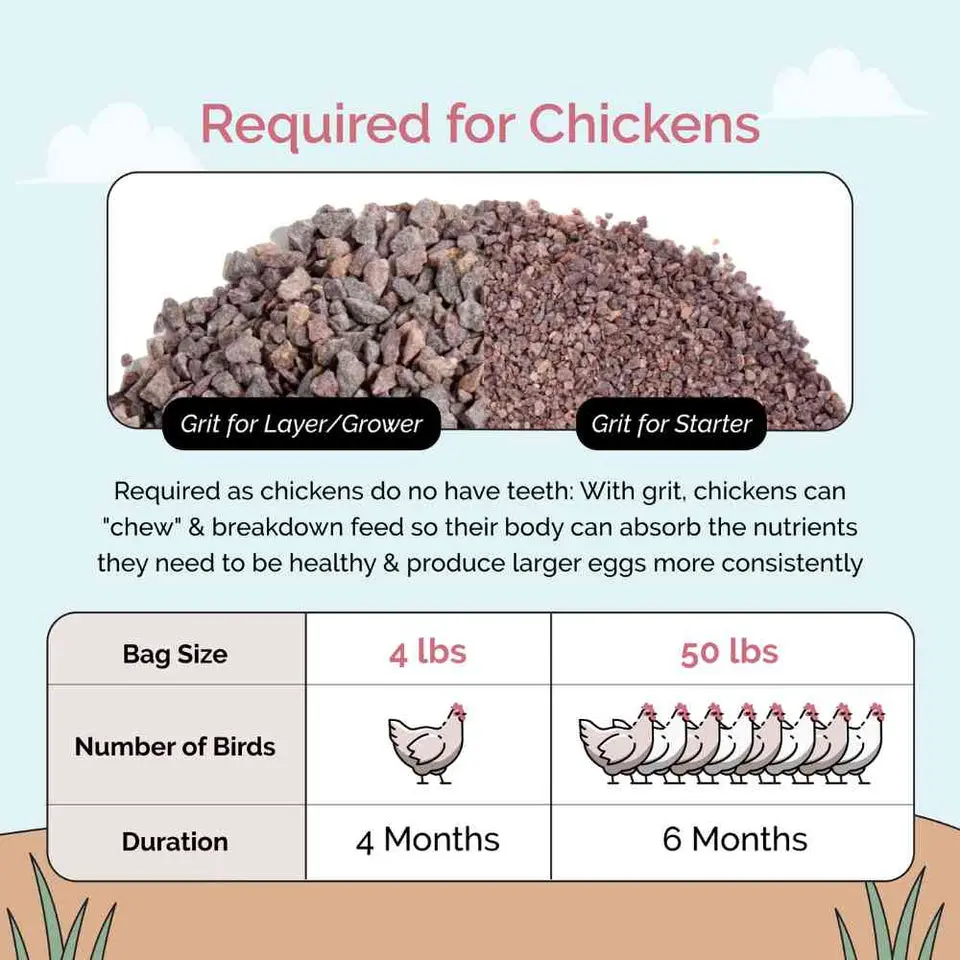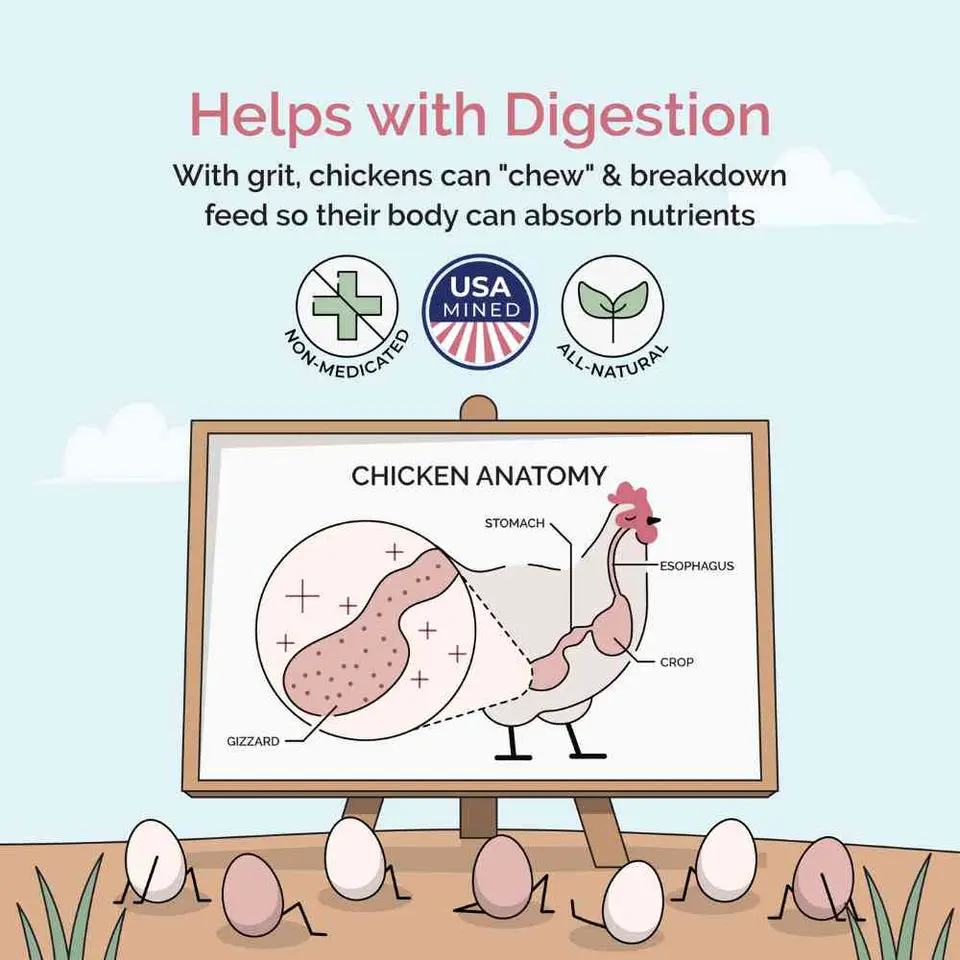 With grit, chickens can "chew" & breakdown feed so their body can absorb the nutrients they need to be healthy & produce larger eggs more consistently