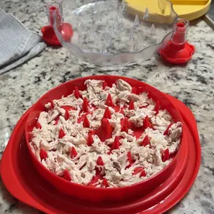 【Ergonomic Non-Slip Design】 The large chicken shredder tool features four non-slip rubber pads on the bottom to prevent slipping during use. It stays firmly in place even on smooth surfaces, ensuring safer and more convenient operation. For extra grip on particularly smooth countertops, we recommend placing a kitchen towel underneath the chicken shredder when using it.