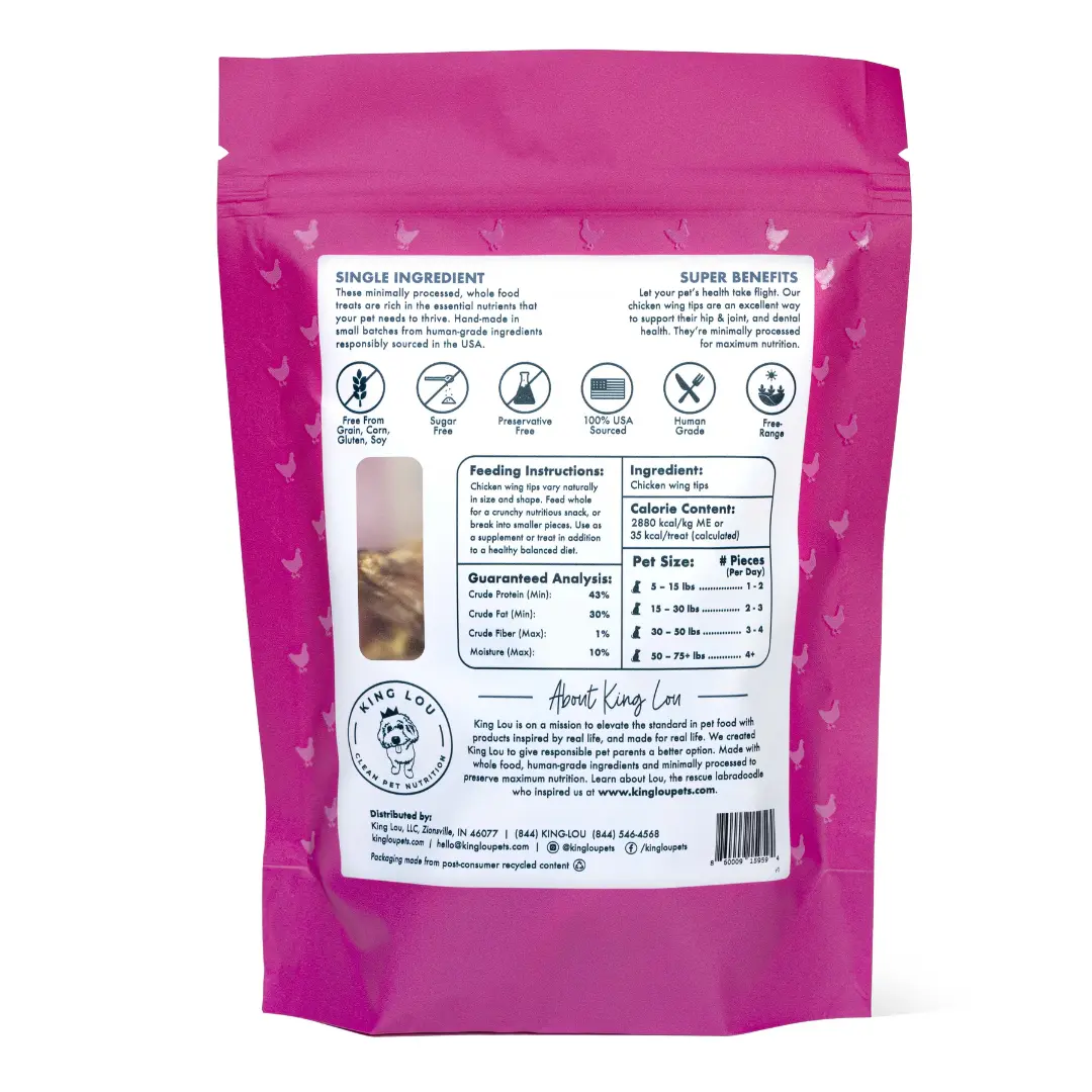These chicken wing tips are so amazing, they are the perfect size to add into my dogs dinner. They smell delicious and you can tell that they are super fresh. Also loving how clean they are keeping my dogs teeth! Definitely will be buying again!
