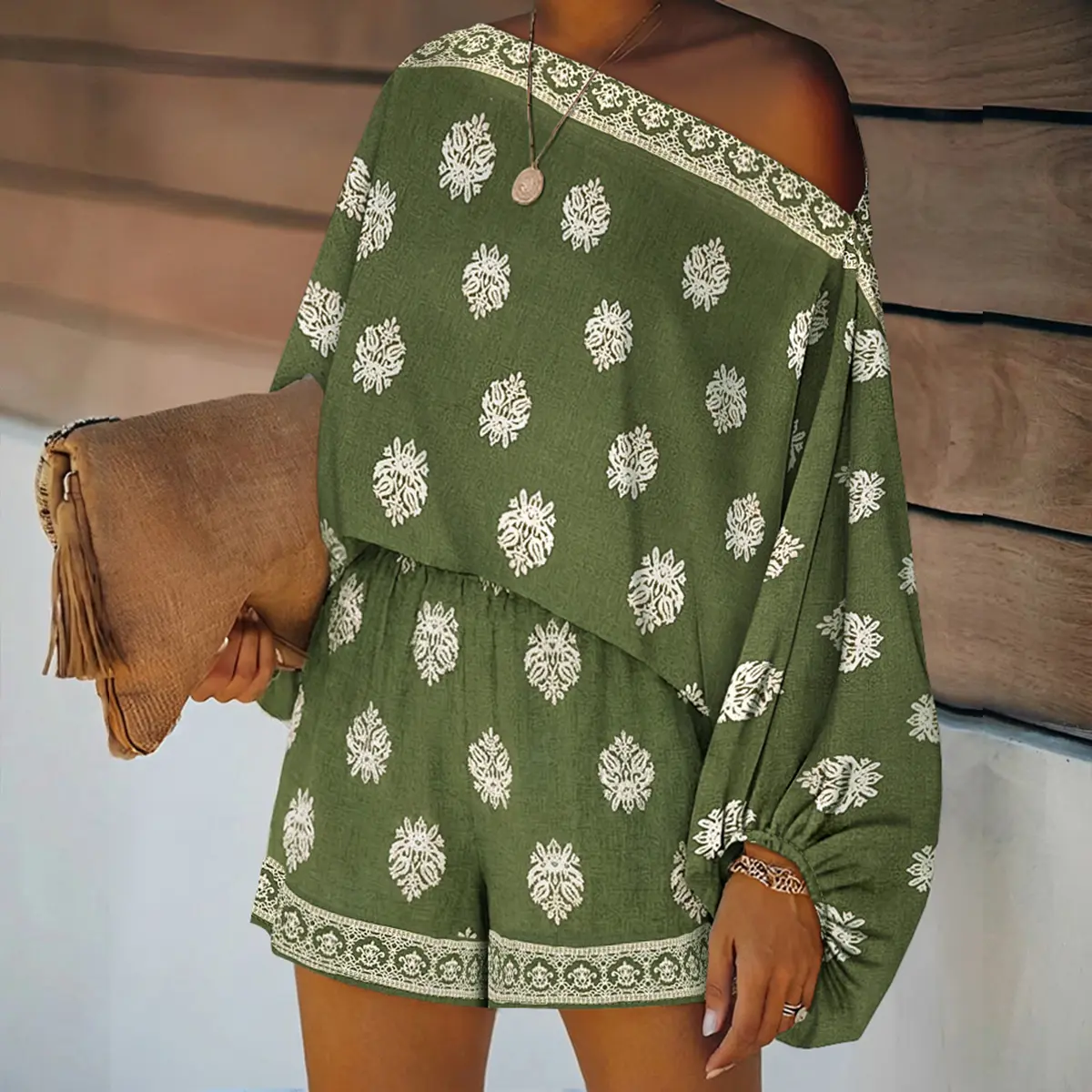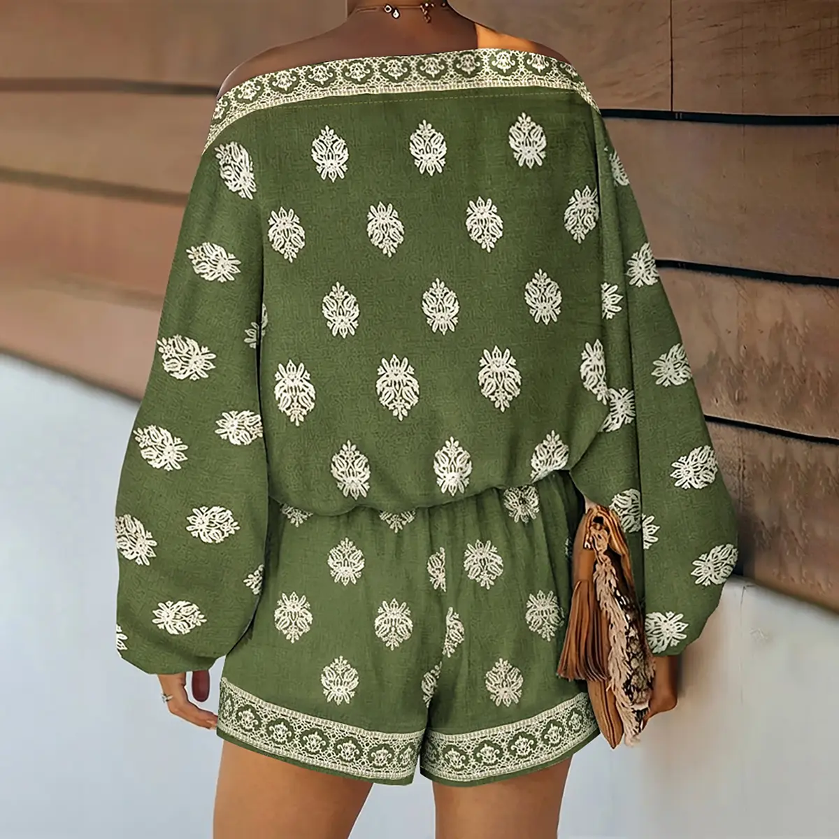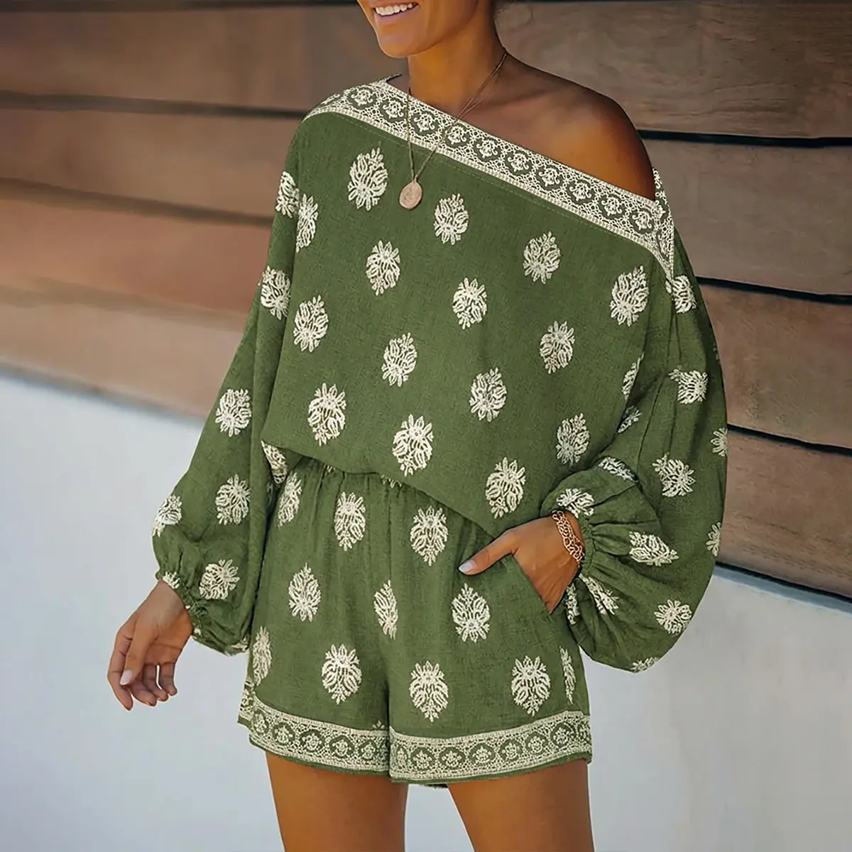 ·Design Details: Boho baroque placement print highlights the vintage-inspired style; coordinating patterns at neckline and shorts hem add cohesion, while shorts include functional pockets for practicality without sacrificing aesthetics.