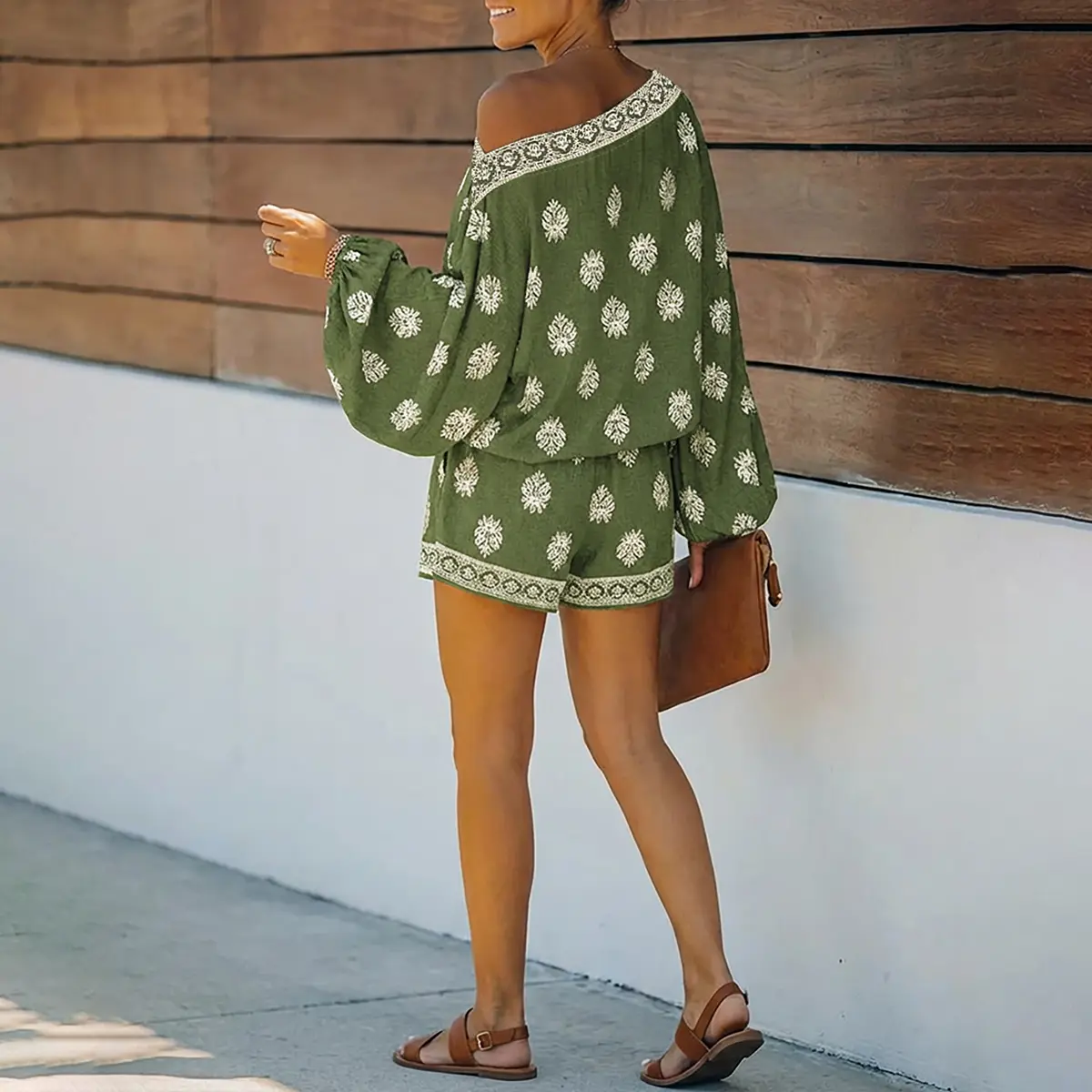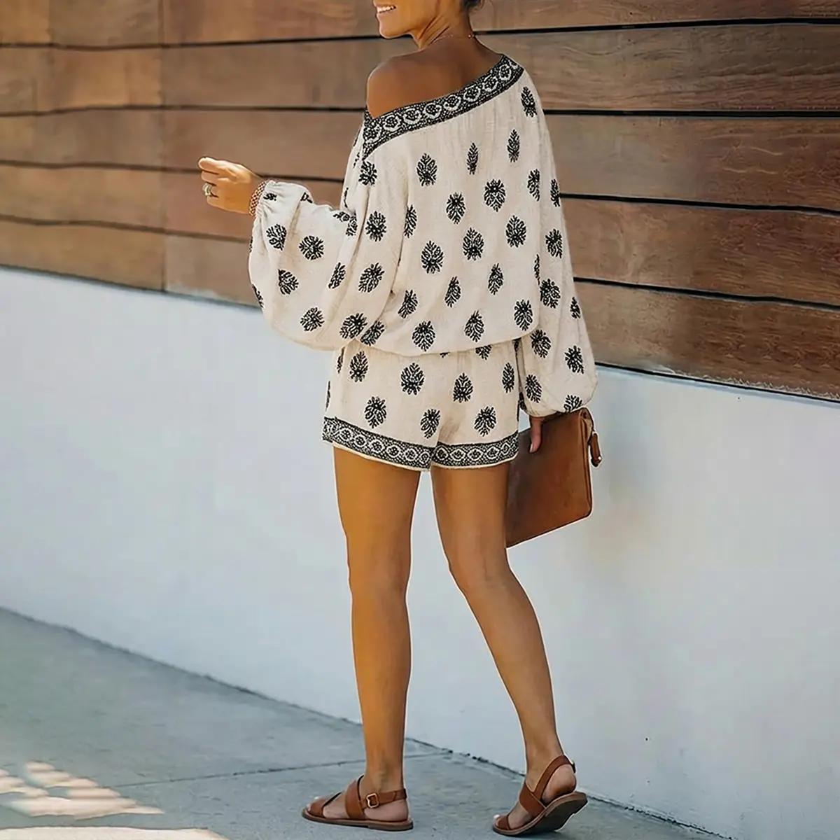 ·Silhouette & Fit: Features a skew neck with exposed shoulder, loose lantern sleeves, and elastic waist shorts, creating a relaxed, flattering silhouette that comfortably fits various body shapes while elongating the legs.