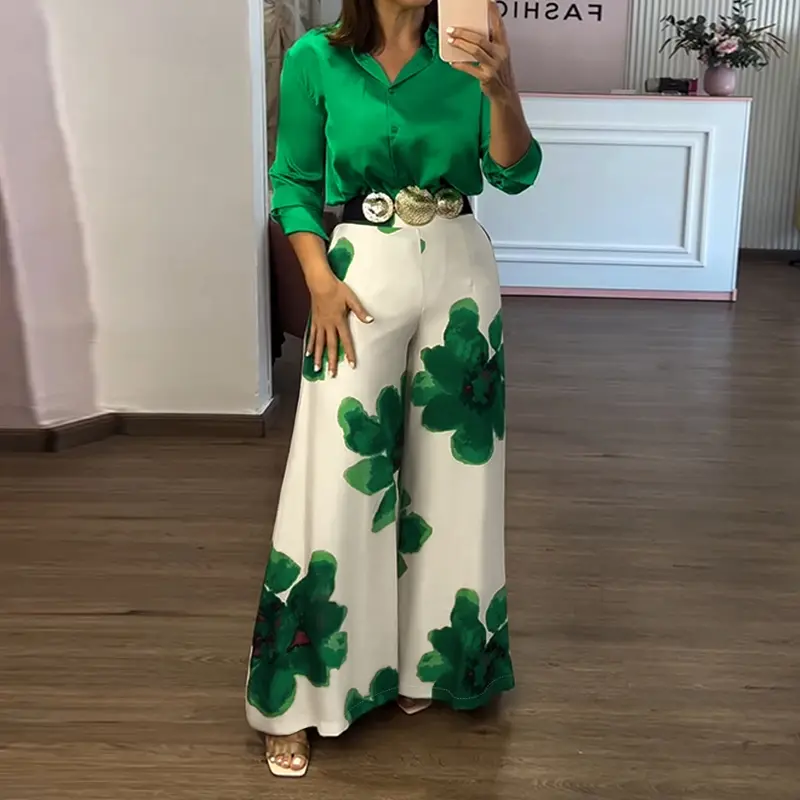 ·Floral Wide Leg Pants – High waist flowy pants feature bold ink-wash green floral prints, elongating the legs while exuding artistic charm.