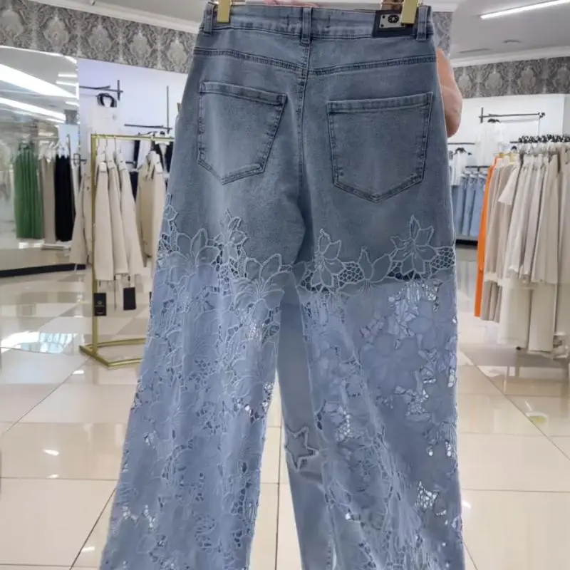 ChicMe Guipure Lace Spliced High Waist Zipper Fly Wide Leg Washed Jeans