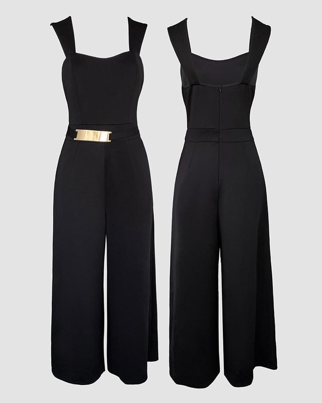 ·Square neckline – Clean square neckline on the jumpsuit frames the collarbone and shoulders, perfect for layered jewelry styling.