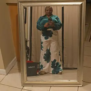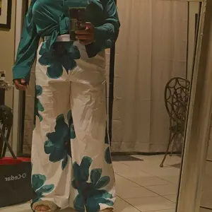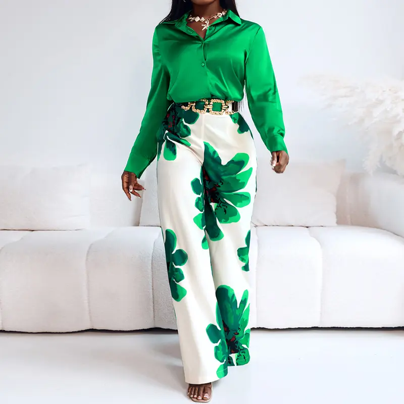 ·Floral Wide Leg Pants – High waist flowy pants feature bold ink-wash green floral prints, elongating the legs while exuding artistic charm.
