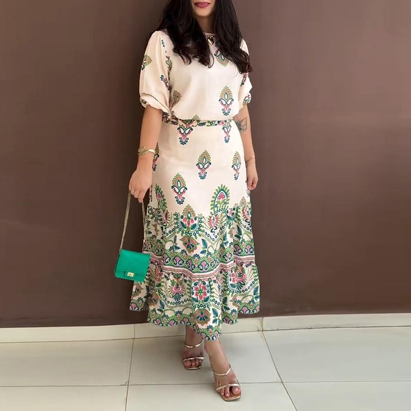 ·Coordinated Printed Midi Skirt – The matching high-waisted skirt with rich allover prints creates a balanced and stylish two-piece outfit.