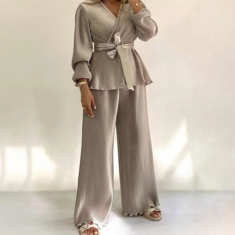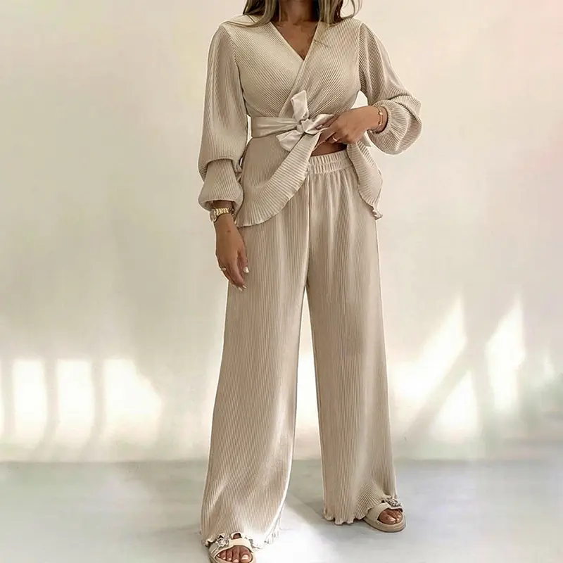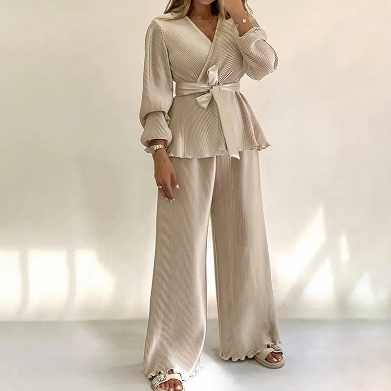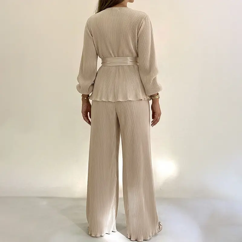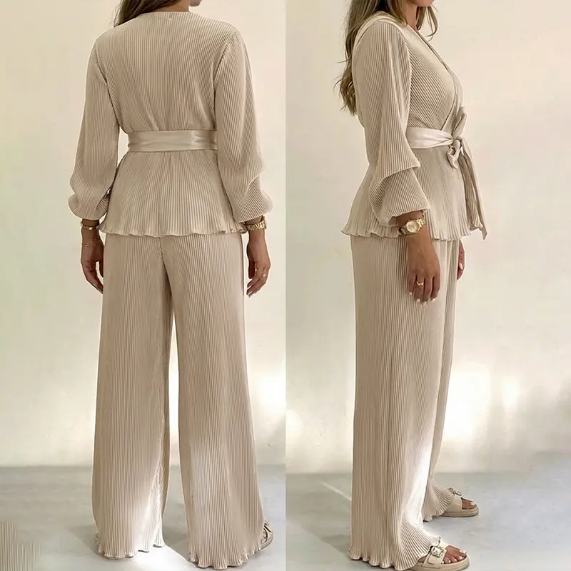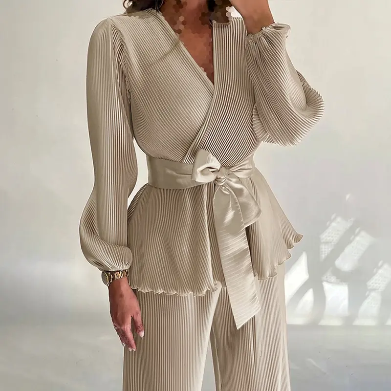 ·Design Details: The top features an overlap V-neck, lantern sleeves, and a ruffled hem that adds layered movement. Satin pleats enhance texture throughout, while the matching pleated wide leg pants echo the flowy structure for a cohesive, refined finish.