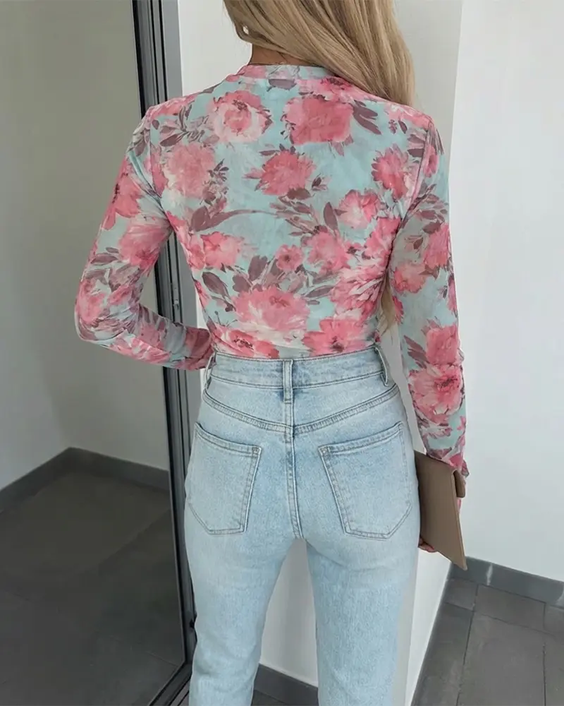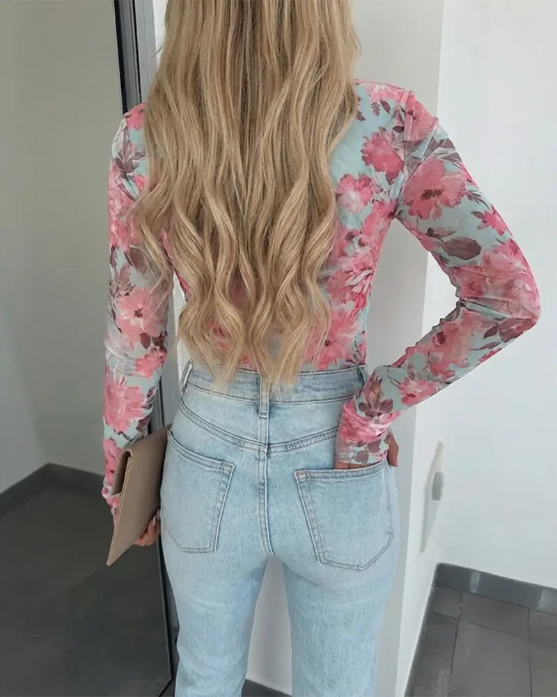 ·Design Details: Featuring an allover watercolor floral print, the mesh surface creates a romantic, artistic effect. The classic O-neck keeps the look clean and versatile, while thumb hole cuffs add functional detail and visual layering interest to the long sleeves.