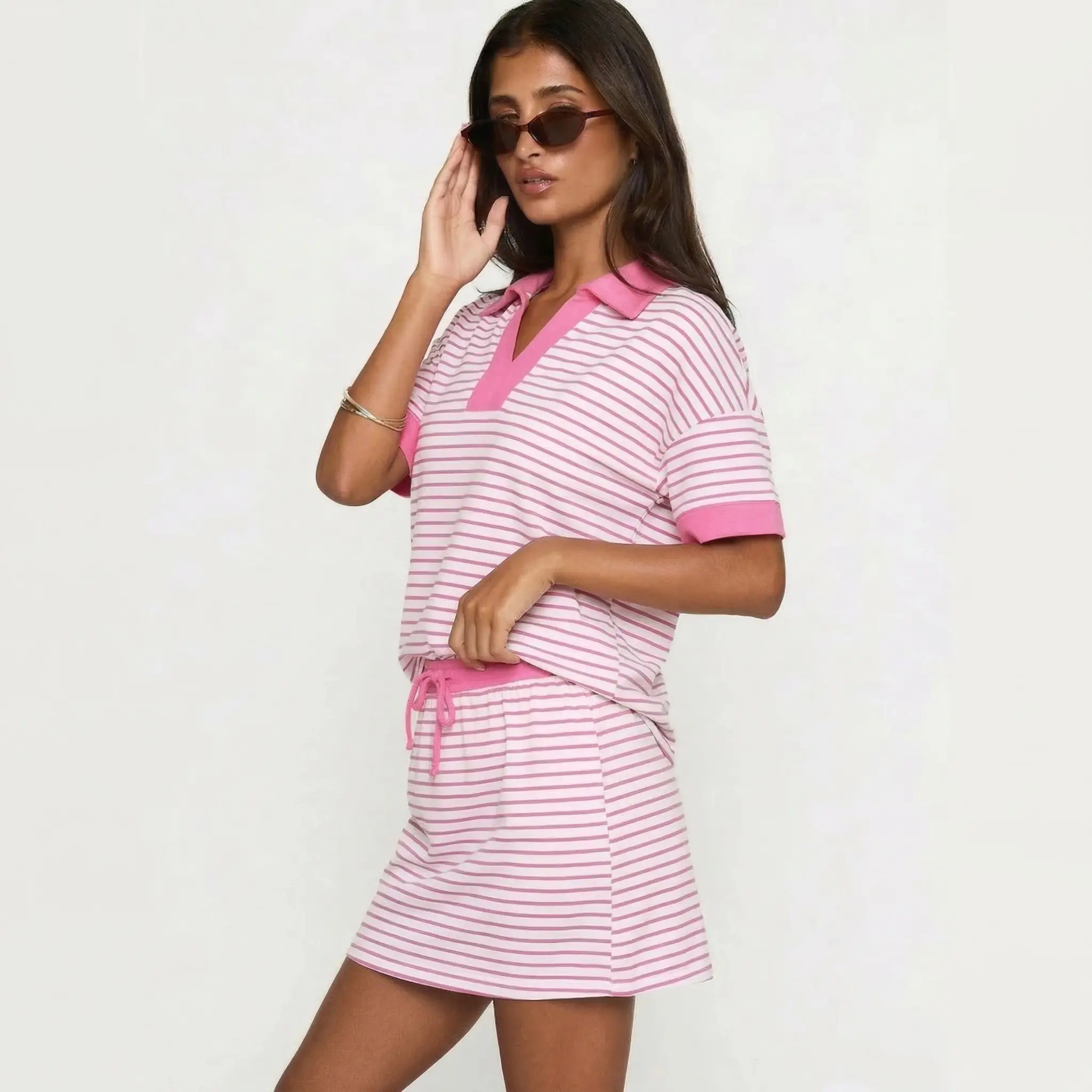 Chicovar Striped 2 Piece Outfits Casual Set  Short Sleeve V-Neck Polo Skort with Built-in Shorts & Pockets, Adjustable Waist, Stretchy & Comfortable, Lounge Sets, Athleisure, Comfyoutfit, Casualoutfits