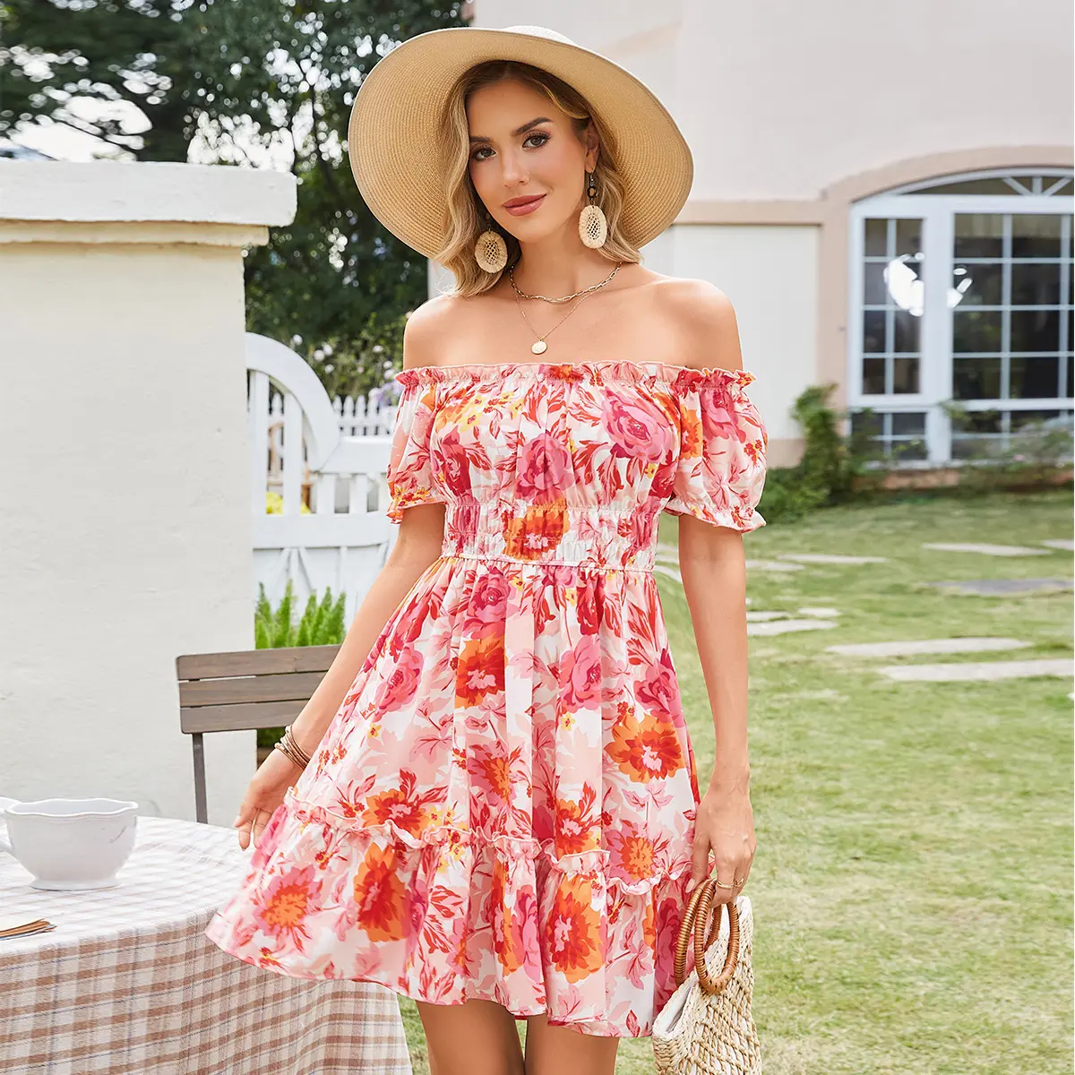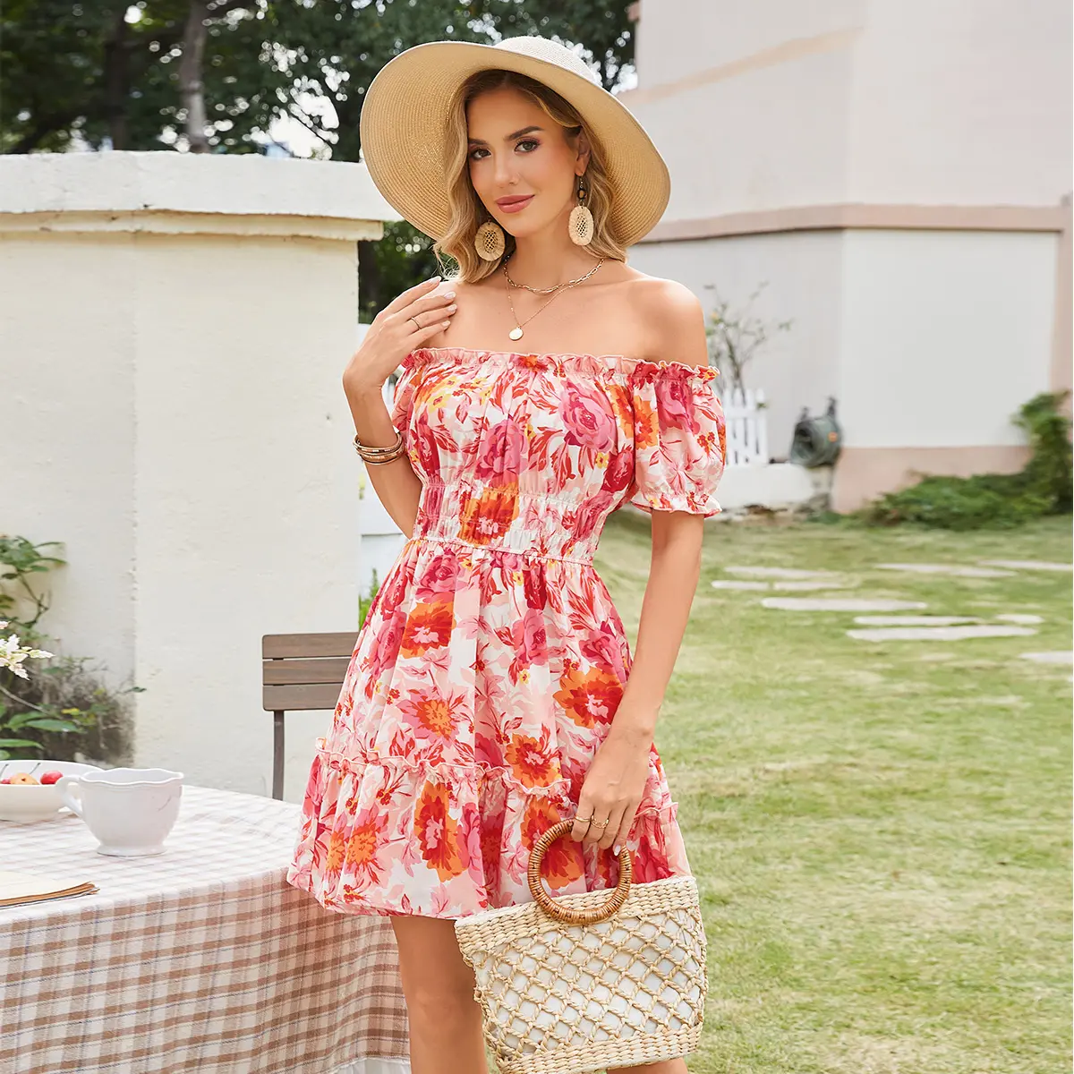5. Chicovar Women's Summer Floral Print Mini Dress with Pockets, Off Shoulder & Square Neck Ruffle Short Sleeve Smocked Waist A-Line Dress for Wedding Guest, Vacation & Date Night, Valentine’s Day