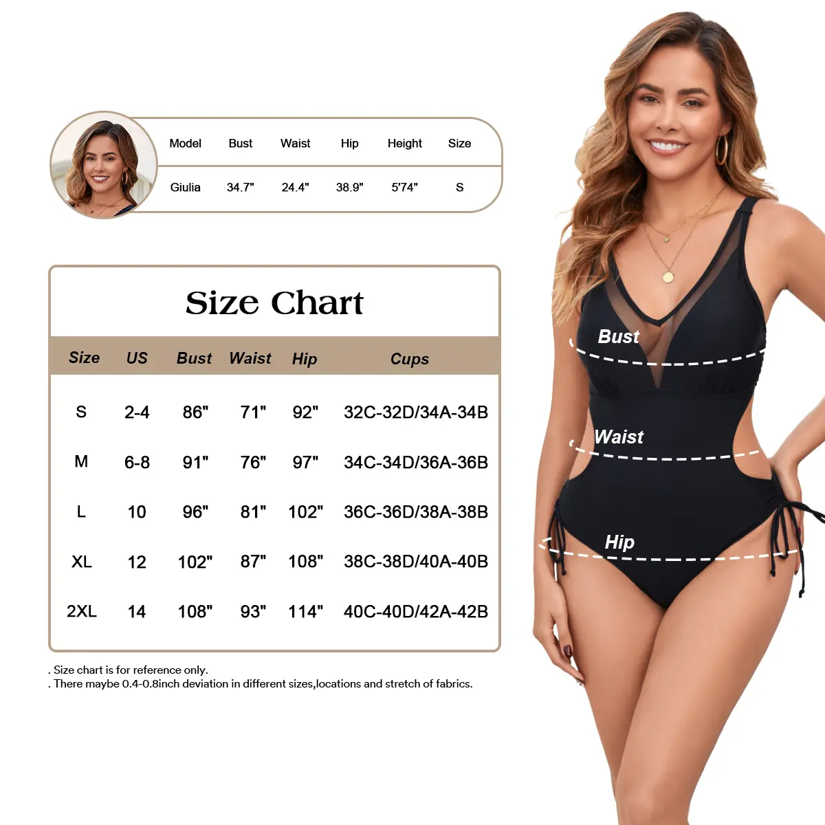 10/10...I am 5'3 220 book size 40F and I got an XL and this is a perfect fit I will pose a Pic on my vacation