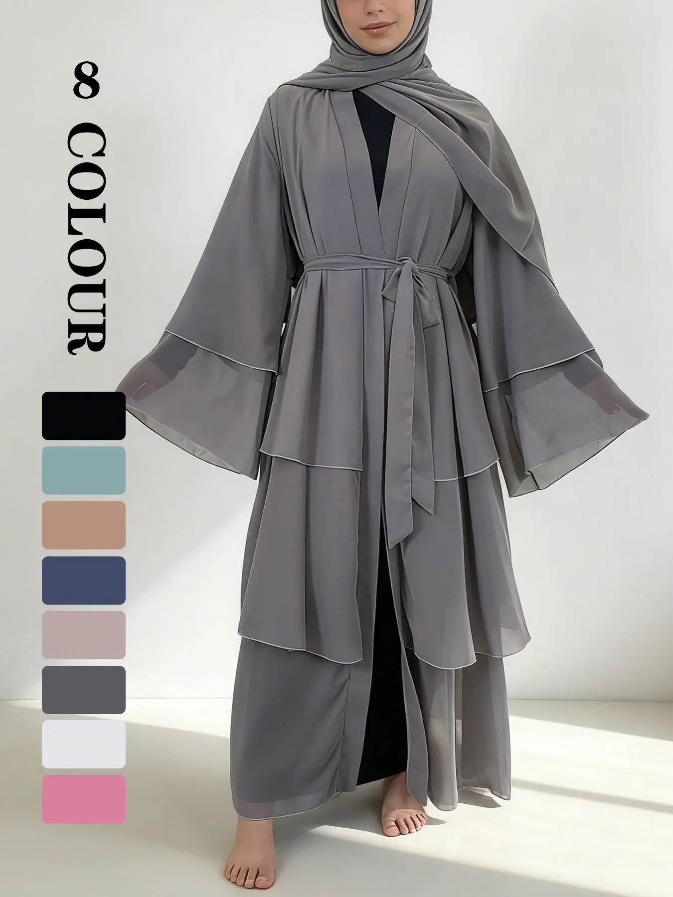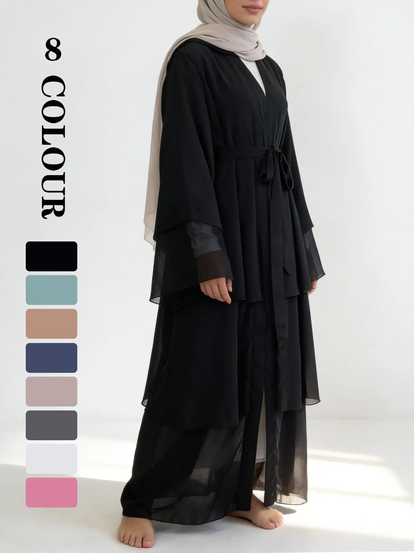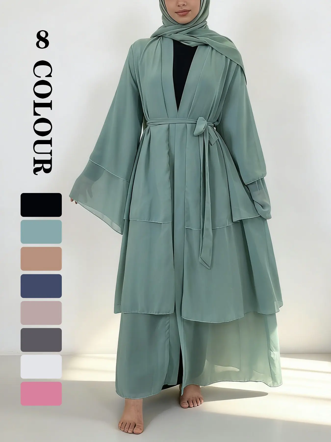 5. Spring Summer High-Quality Chiffon 3-Layer Eid Abaya with Belt, Casual Party Dress, Comfortable Breathable Fabric, Perfect for Weddings