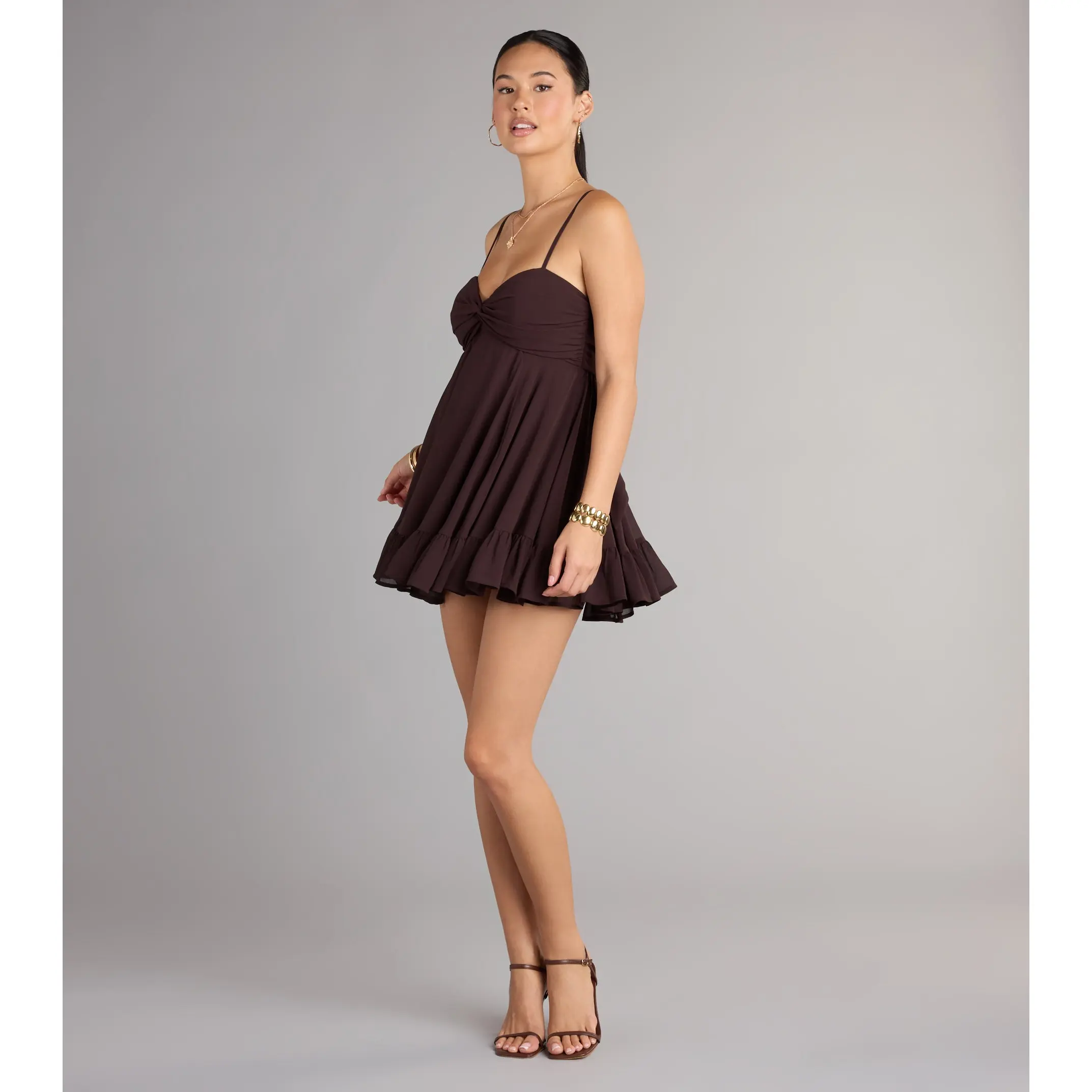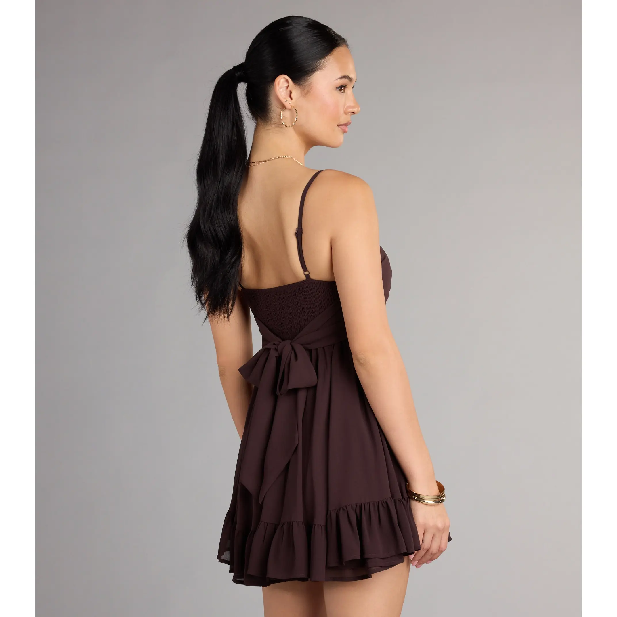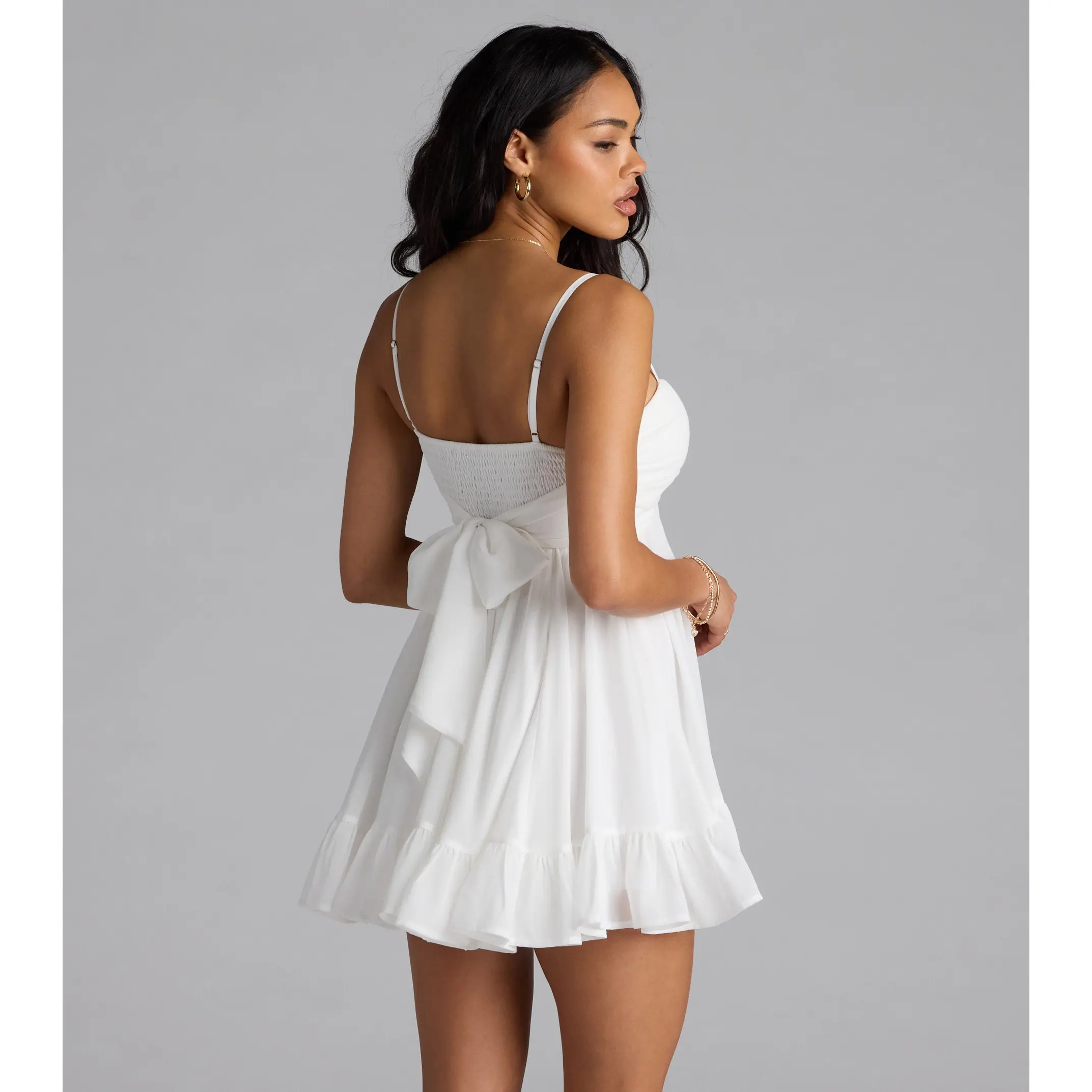 Perfectly pretty in the sweetest babydoll silhouette, this mini-length dress offers an adorable tie-back detail and ruffled trim hem for an effortless flounce with every step! Style with heels for shower celebrations or graduation.