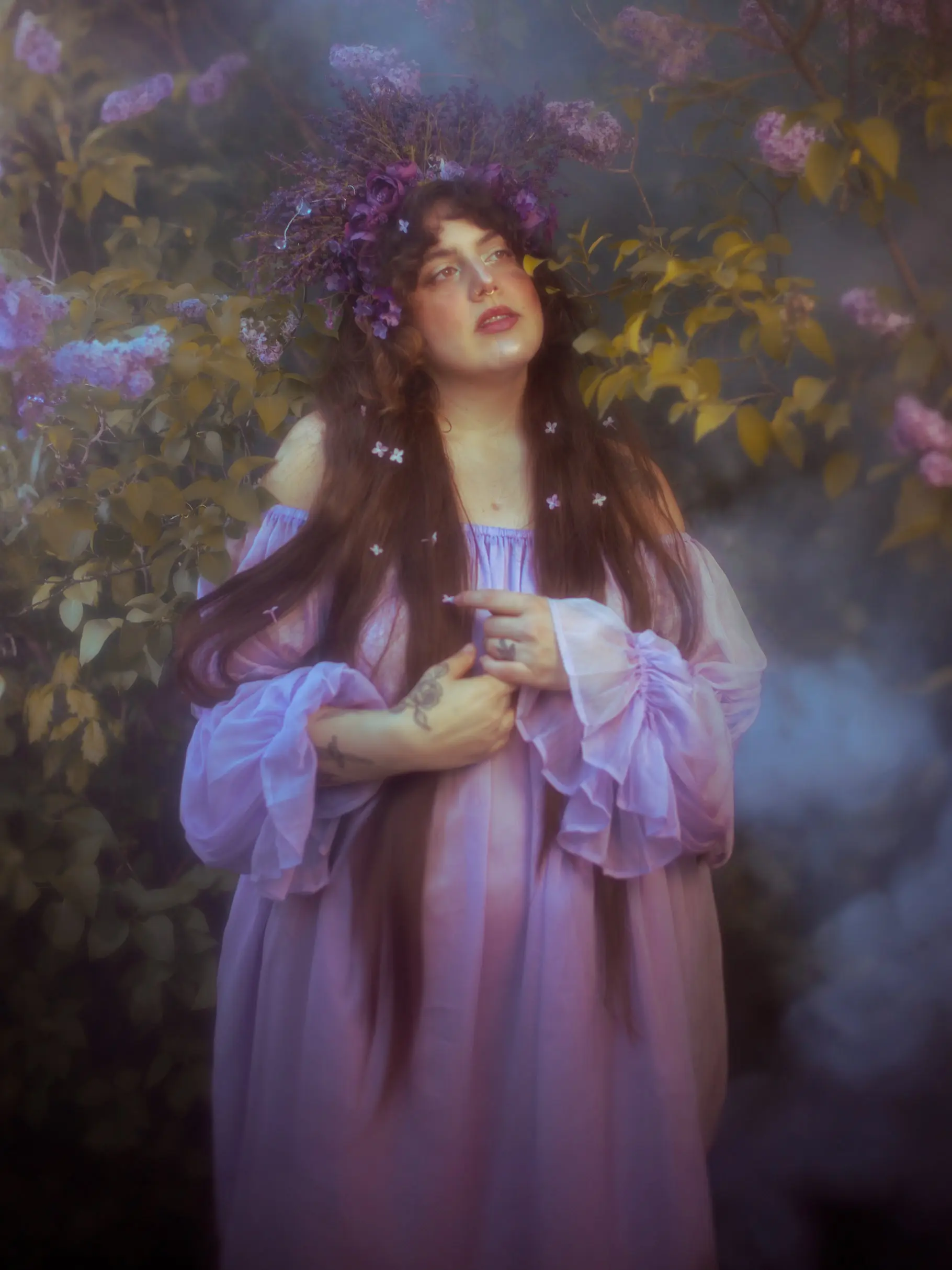 The flutter fairy dress 💜 if you’ve been here for a while you know I’ve been working on this dress since last summer. It started out as a dress I made just for me but I was smitten with it (as were all of you) so I’ve been working to make it a reality ever since!  This babydoll dress can be worn on its own, belted into an empire style, worn as a nightgown, layered over dresses, under corsets, and even worn as a skirt! The pointed fairy hem reminds me of flower petals and the shiny iridescent fabric reminds me of morning dew 🤍 this dress also comes in two other colors for every color of fairy 🩷💚💜 #fairycore #fairycosplay #faerie