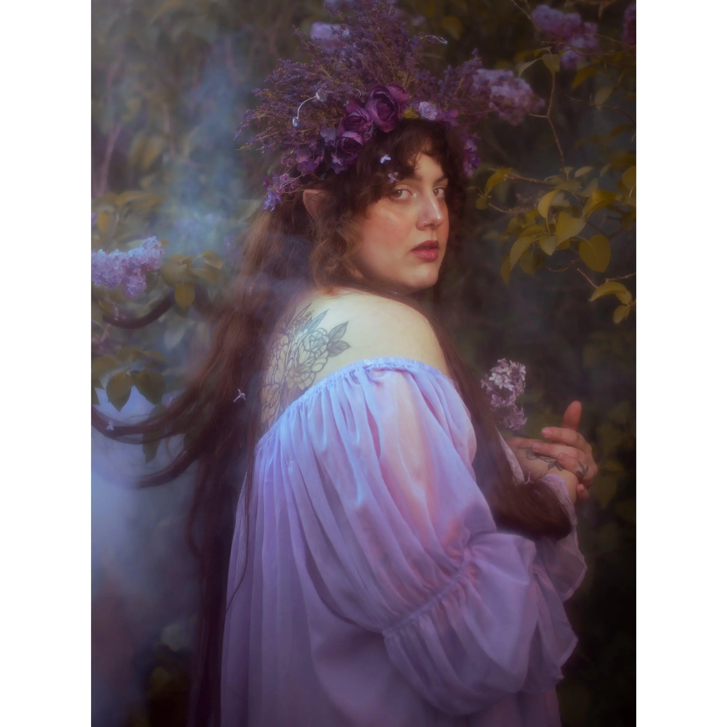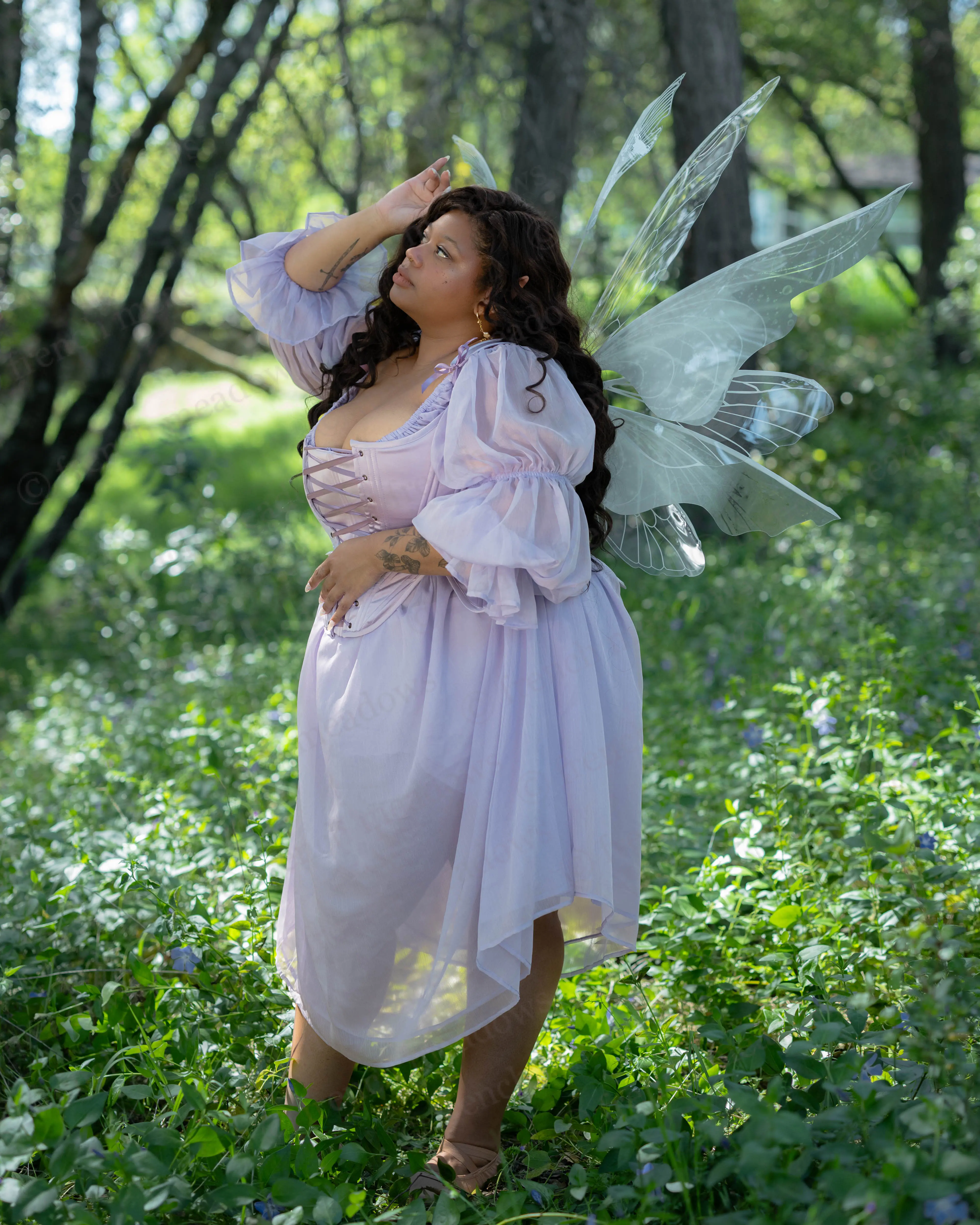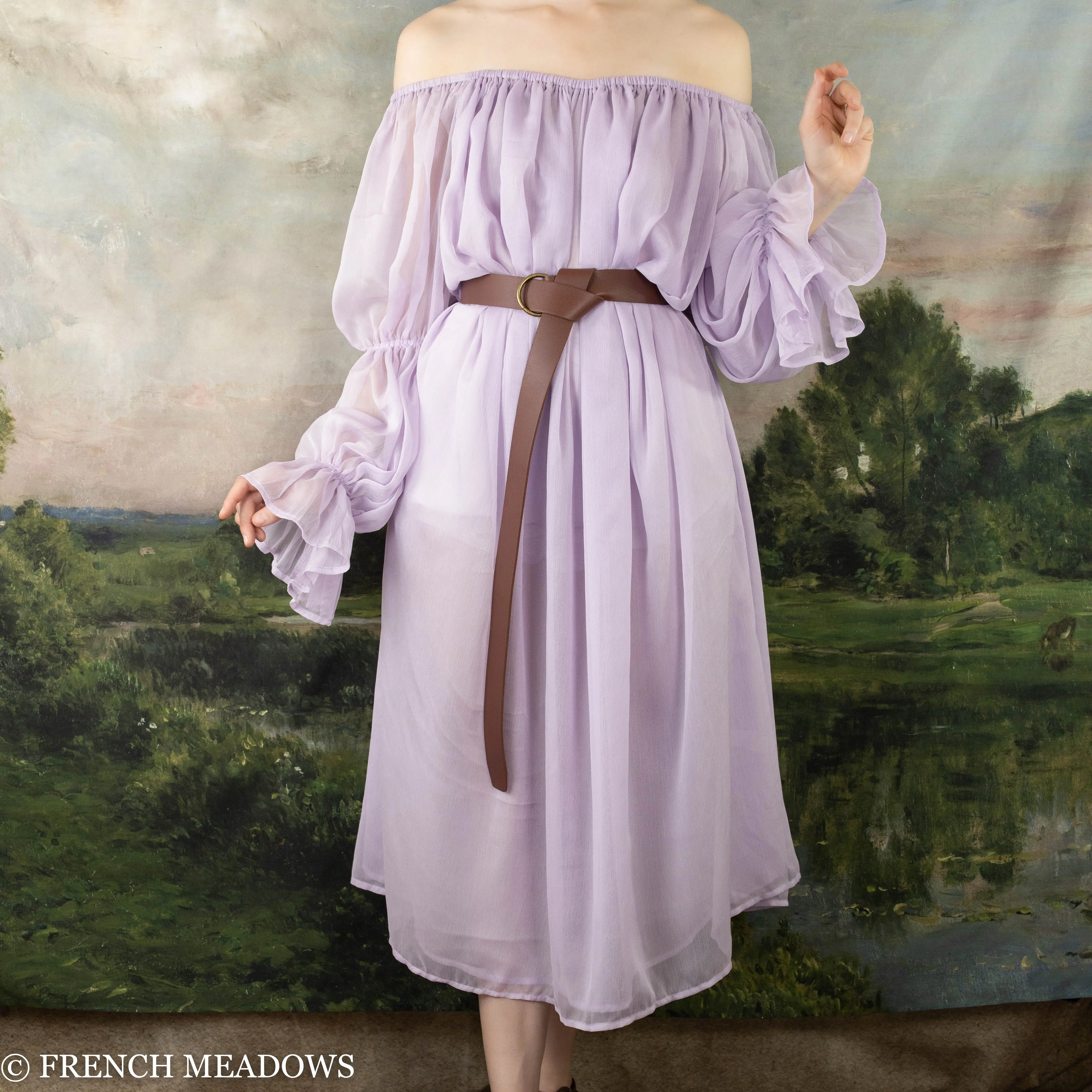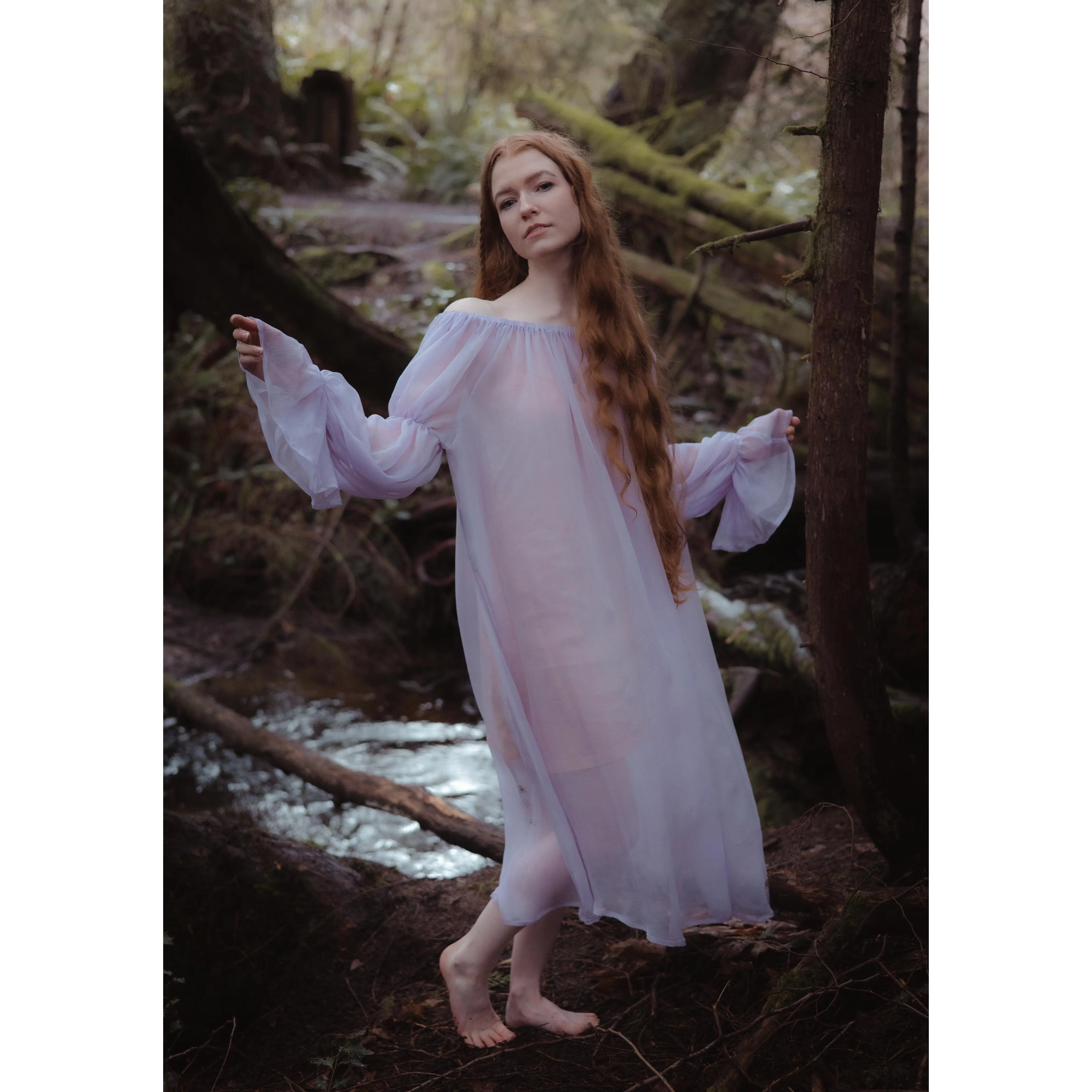 Introducing our Lilac Chiffon Chemise, the perfect blend of elegance and whimsy! Made from luxurious crinkle chiffon, this enchanting chemise features a stunning light lavender color that exudes femininity and grace. The puff sleeves add a touch of fairy tale magic, making it a unique and charming addition to your wardrobe. The lightweight fabric drapes beautifully on the body, making you feel like you're wearing a cloud. The flowing silhouette creates a romantic and ethereal look that is perfect for a garden party or enchanted forest adventure. Whether you're dressing up for a special occasion or simply want to feel like a fairy princess, our Lilac Chiffon Chemise is the perfect choice. This listing is for the chemise ONLY. Corset sold separately. Please note that chiffon is very sheer. You will need to wear a slip underneath this chemise if you want to wear it on it's own.