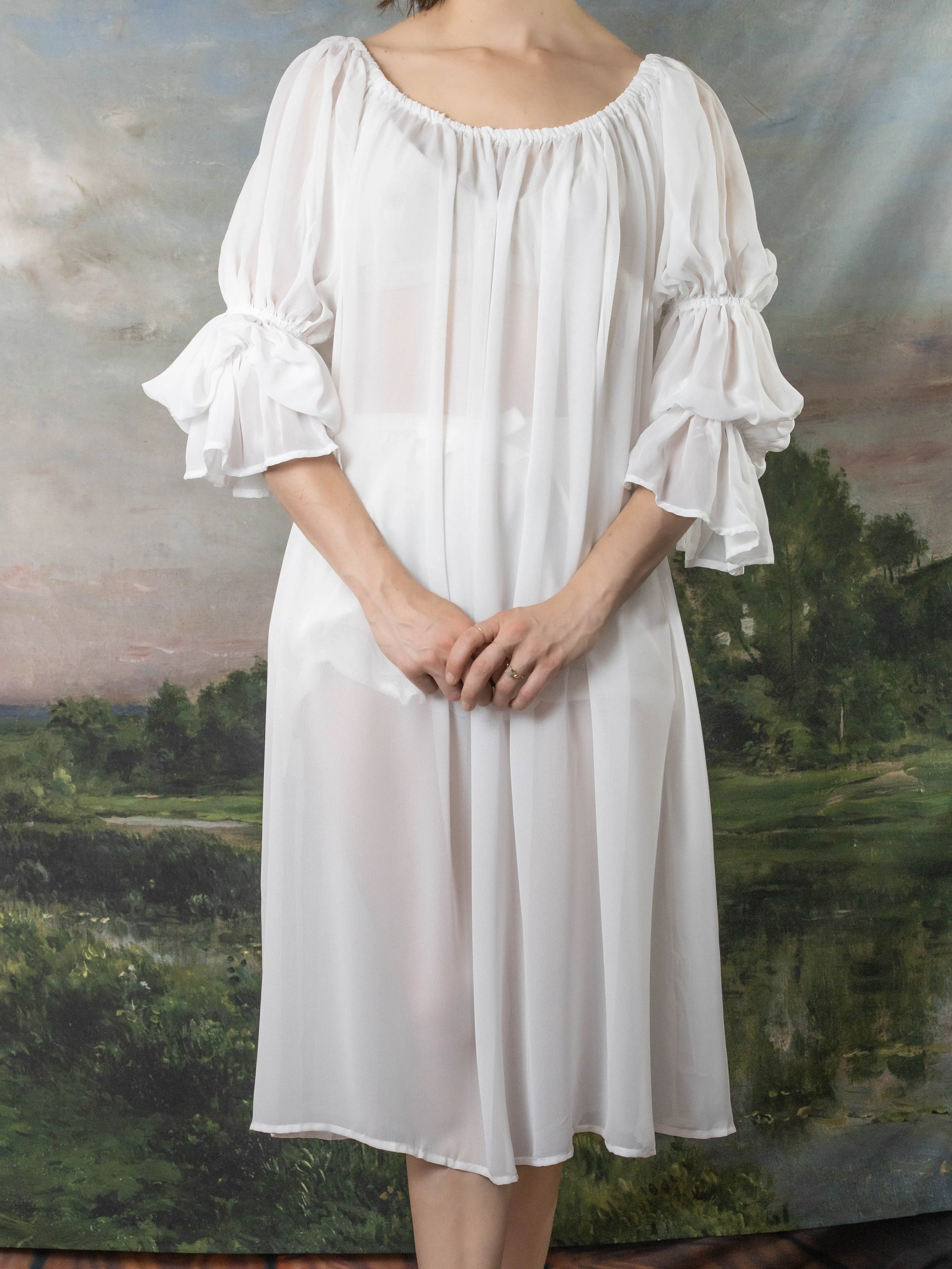 Feel like royalty in this silky chemise made from chiffon. Lightweight and dreamy, this off-the-shoulder peasant chemise is the perfect staple to wear under your corset or costume. This chemise features elastic at the neckline, making for a comfortable and snug fit around your shoulders. Elastic at the sleeve creates a dramatic and billowing sleeve cuff. This dress is a soft shade of white (not optic white). Please note that chiffon is very sheer. You will need to wear a slip underneath this chemise if you want to wear it on it's own. Better yet, pair it with a set of our Victorian Bloomers for a coquettish look.