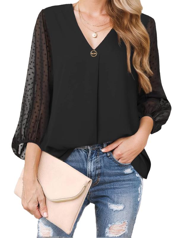 ·Design: This womens blouses and tops dressy, with a V-neck and semi-transparent sleeves, is stylish and versatile. It features Swiss dots and drawstrings for an ideal fit. It's a comfortable, adaptable wardrobe necessity.