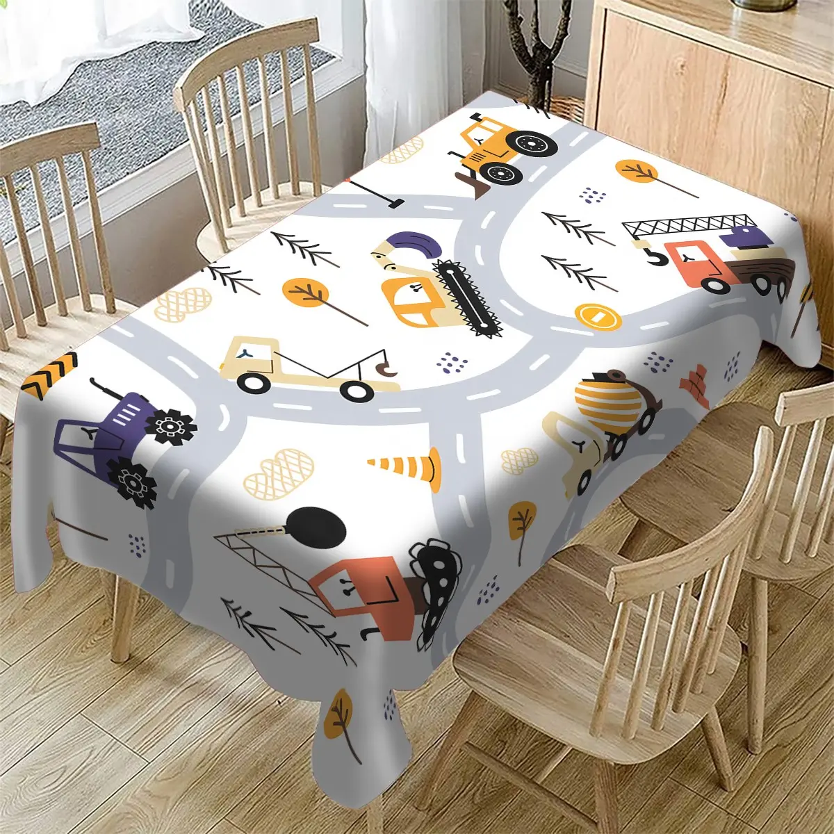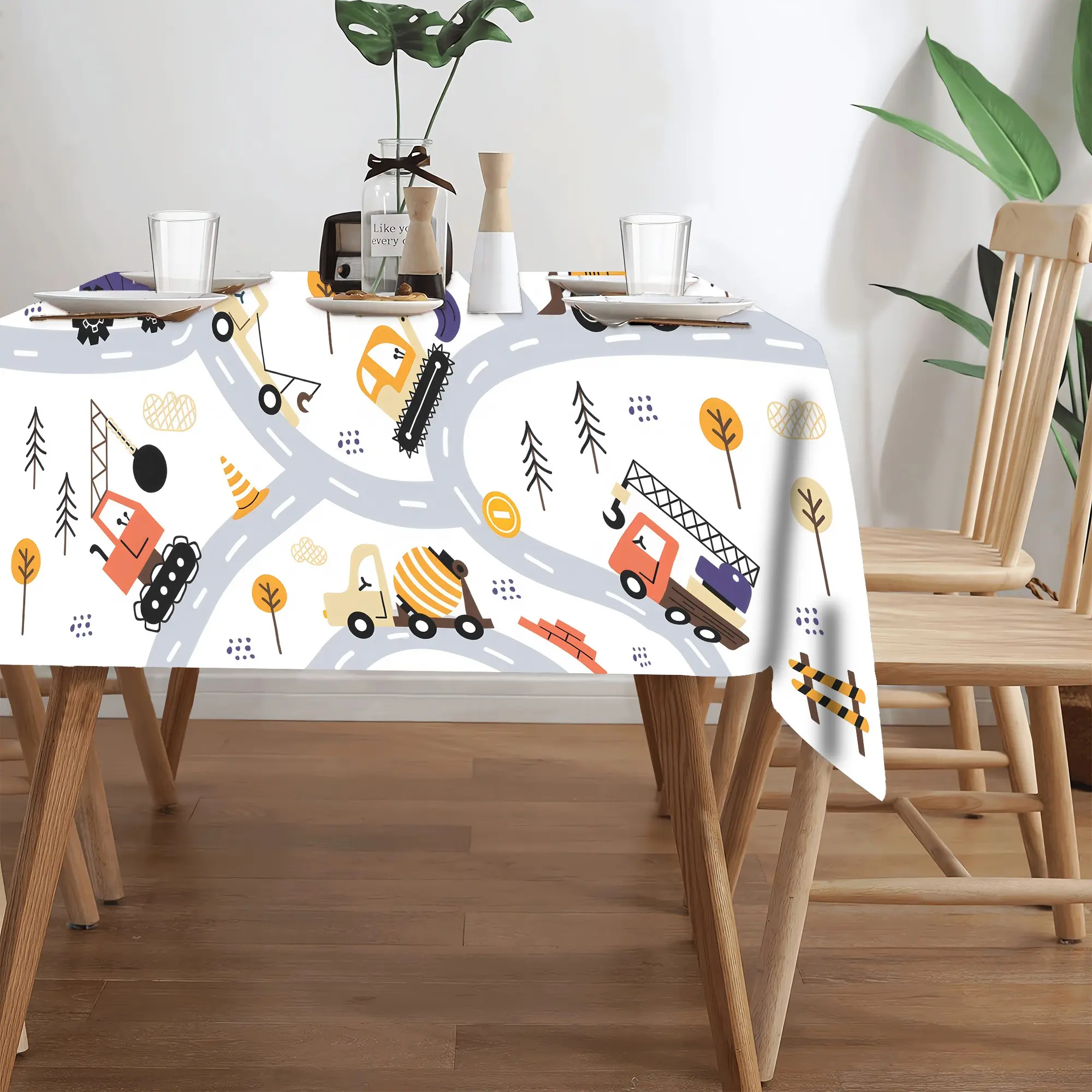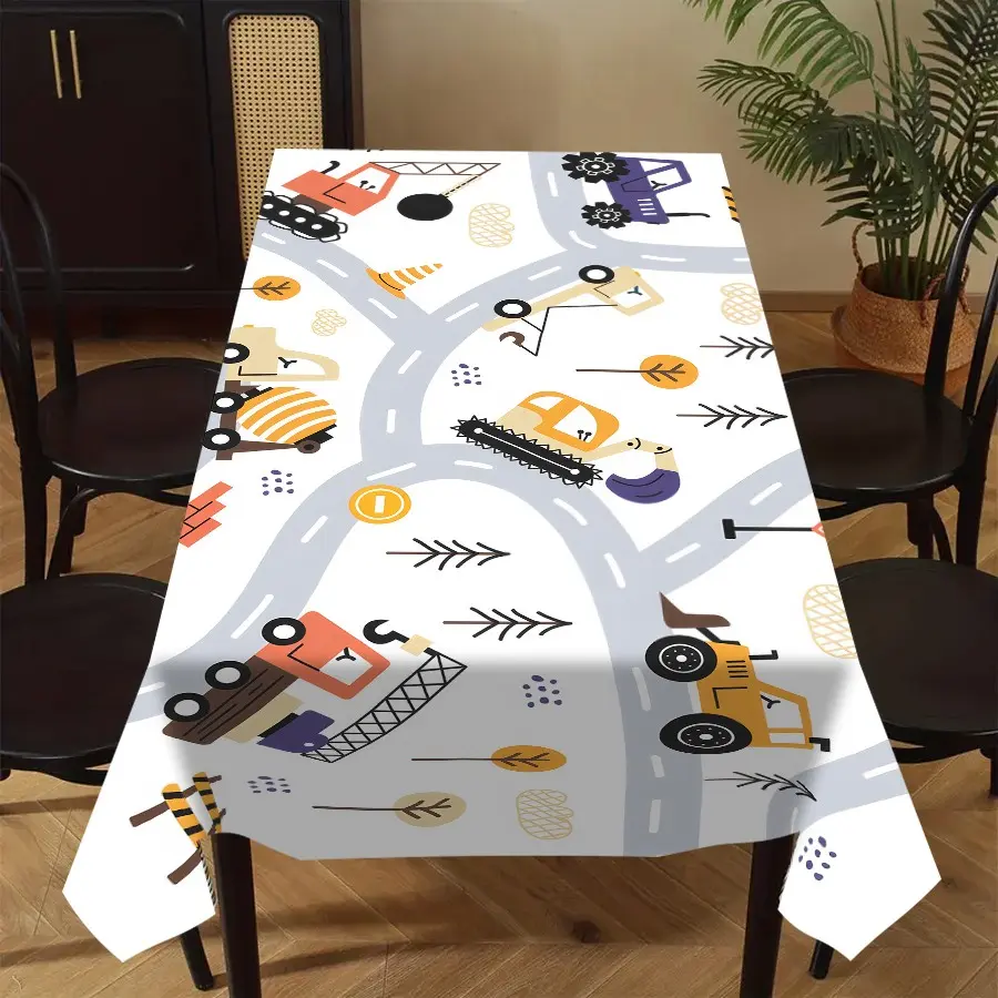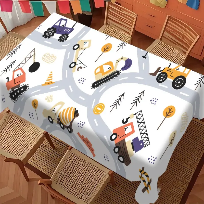 Childish Car Theme Tablecloth, Rectangular Polyester Material, Cartoon Element Decoration, Durable Fabric, Indoor Outdoor Use