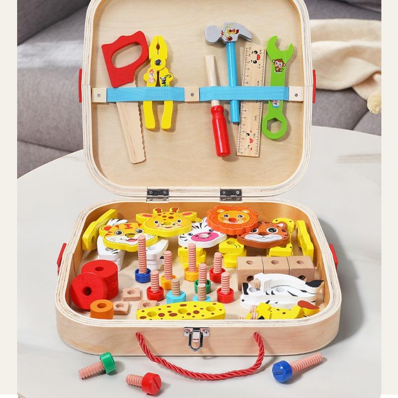 ·Components: Wooden animal-themed tools, hammers, screwdrivers, nuts, and bolts.