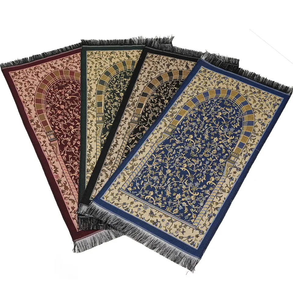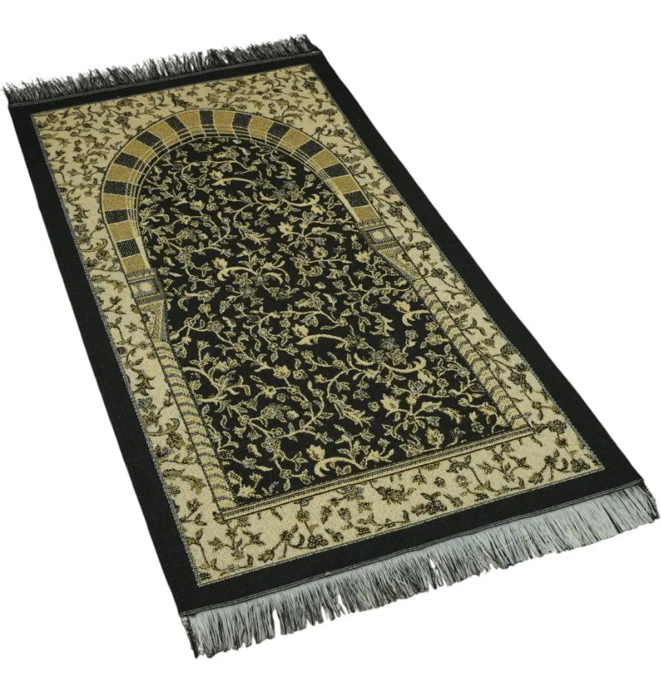 Children's Cotton Woven Islamic Prayer Mat - Hira Garden Arch - Black This beautifully designed Islamic prayer mat features a traditional mihrab with an intricate floral and vine motif that gives this prayer mat an elegant and spiritual feeling. Bordered with a delicate floral frame and fringed tassel, this prayer rug is the perfect choice to have for your kids who are busy and on the go. FEATURES: