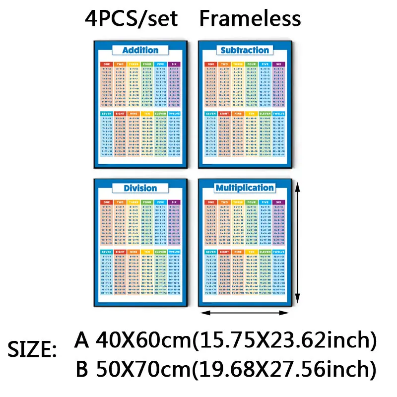 4pcs/set children's education mathematics learning posters, multiplication and division tables, addition and subtraction canvas teaching AIDS, classroom decorations, children's gifts