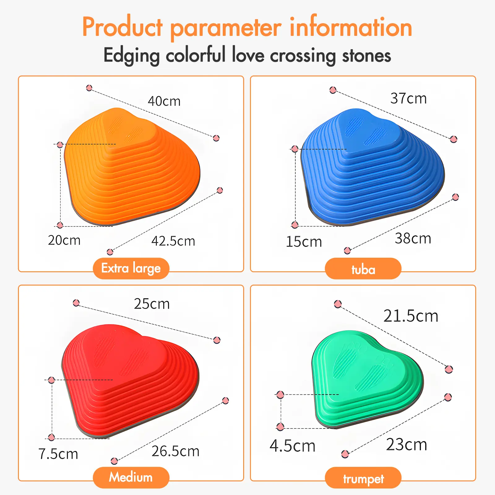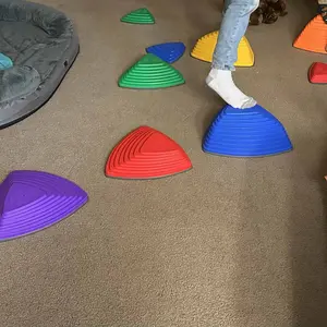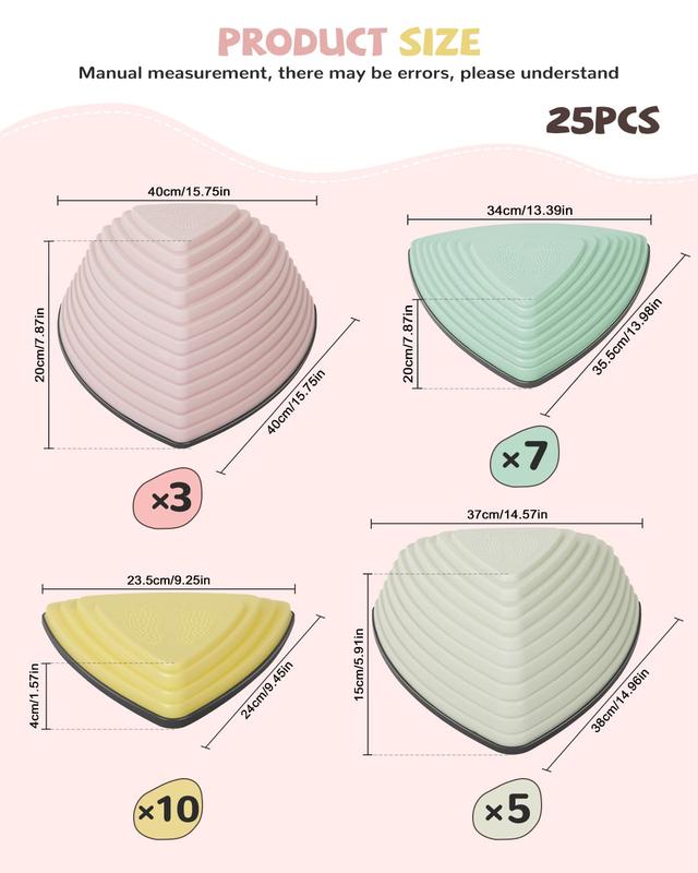 Our GCCSJ river crossing stepping stone has 10 pieces of S type, 7 pieces of M type, 5 pieces of L type and 3 pieces of XL type, 25 pieces in total, which can be used by children to play different games; This kids stone can be used for indoor and outdoor river crossing stepping stone,