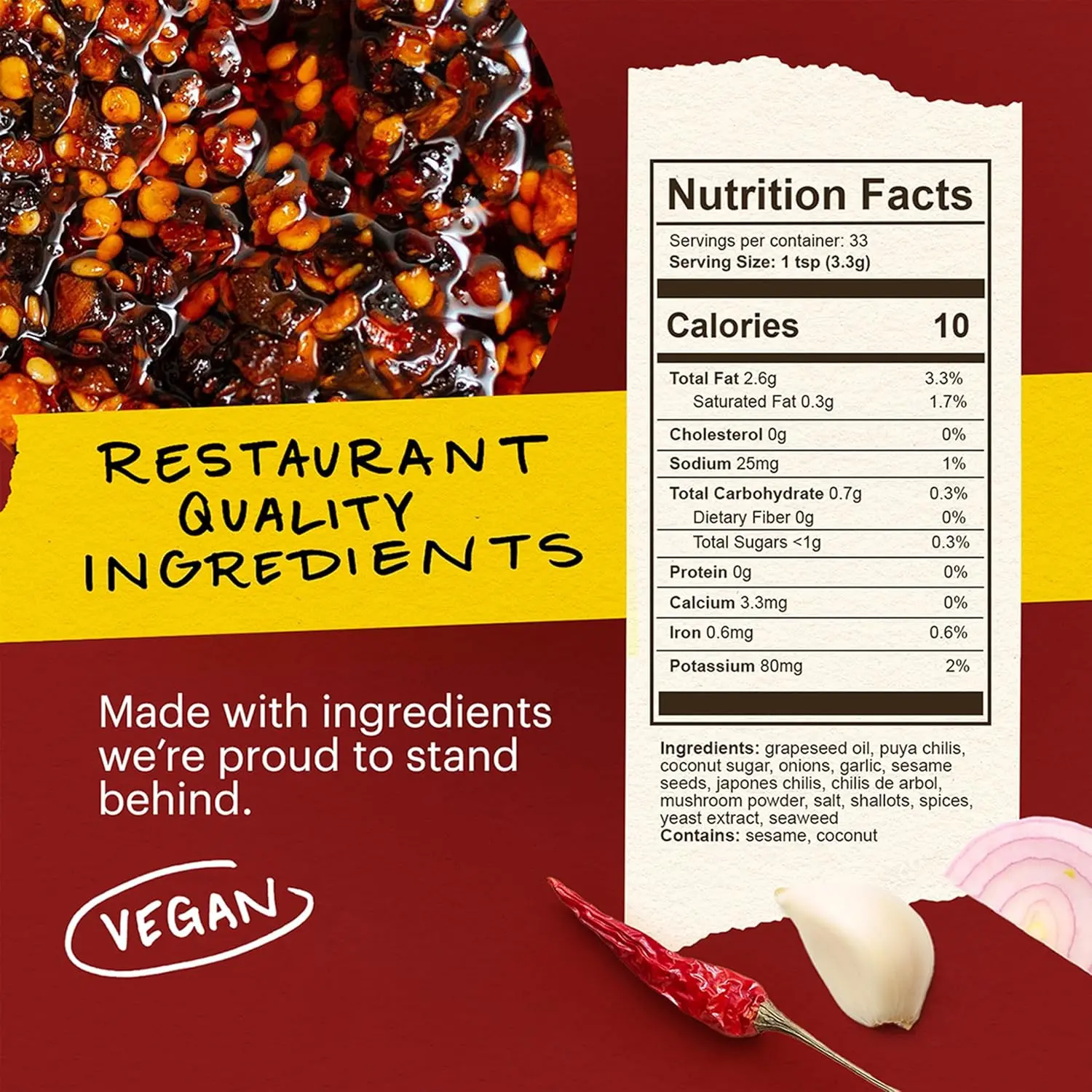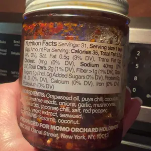 Ingredients: Grapeseed Oil, Puya Chilis, Coconut Sugar, Onions, Garlic, Sesame Seeds, Japones chilis, Chilis de Arbol, Mushroom Powder, Salt, Shallots, Spices, Yeast Extract, Seaweed.c