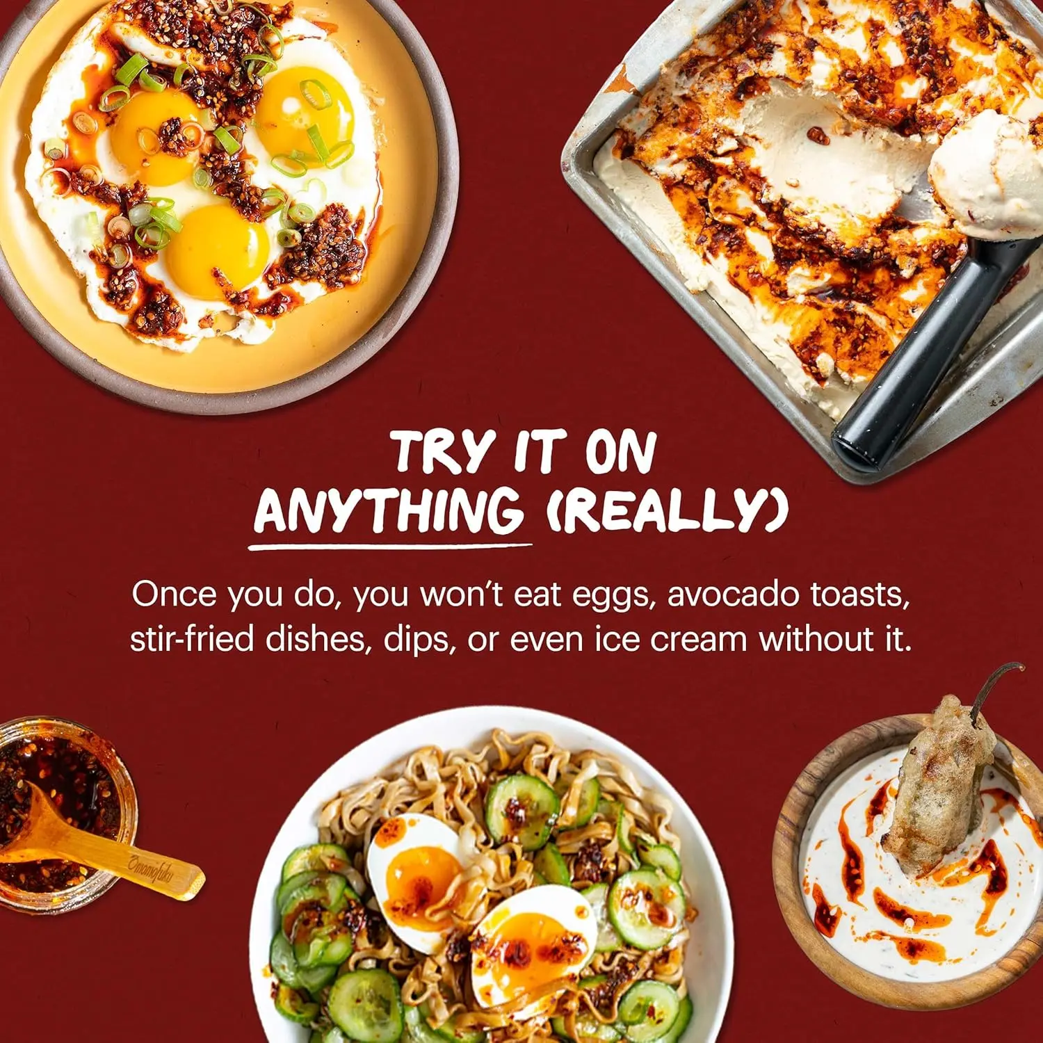 From eggs and avocado toast to stir-fried dishes, dips, and even ice cream — Chili Crunch works everywhere. Once you taste it, you’ll wonder how you ever ate without it.