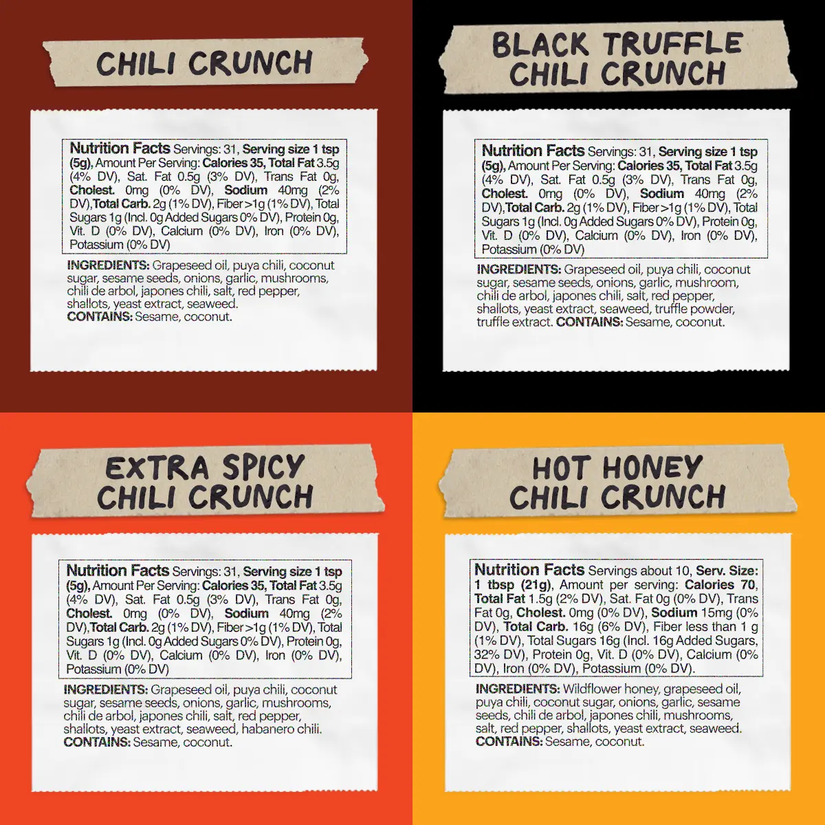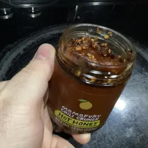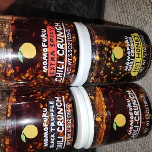 The hot honey was old and crystallized, with the chili bits dried out at the top. Very difficult to get the product out of the jar. I was expecting the honey to be liquid and free flowing. The chili crunch with truffle had some minor leakage issues with some of the oiled having leeched under the plastic seal. Disappointed with my first purchase of these products, mainly due to poor quality control. You can do better Momofuku!