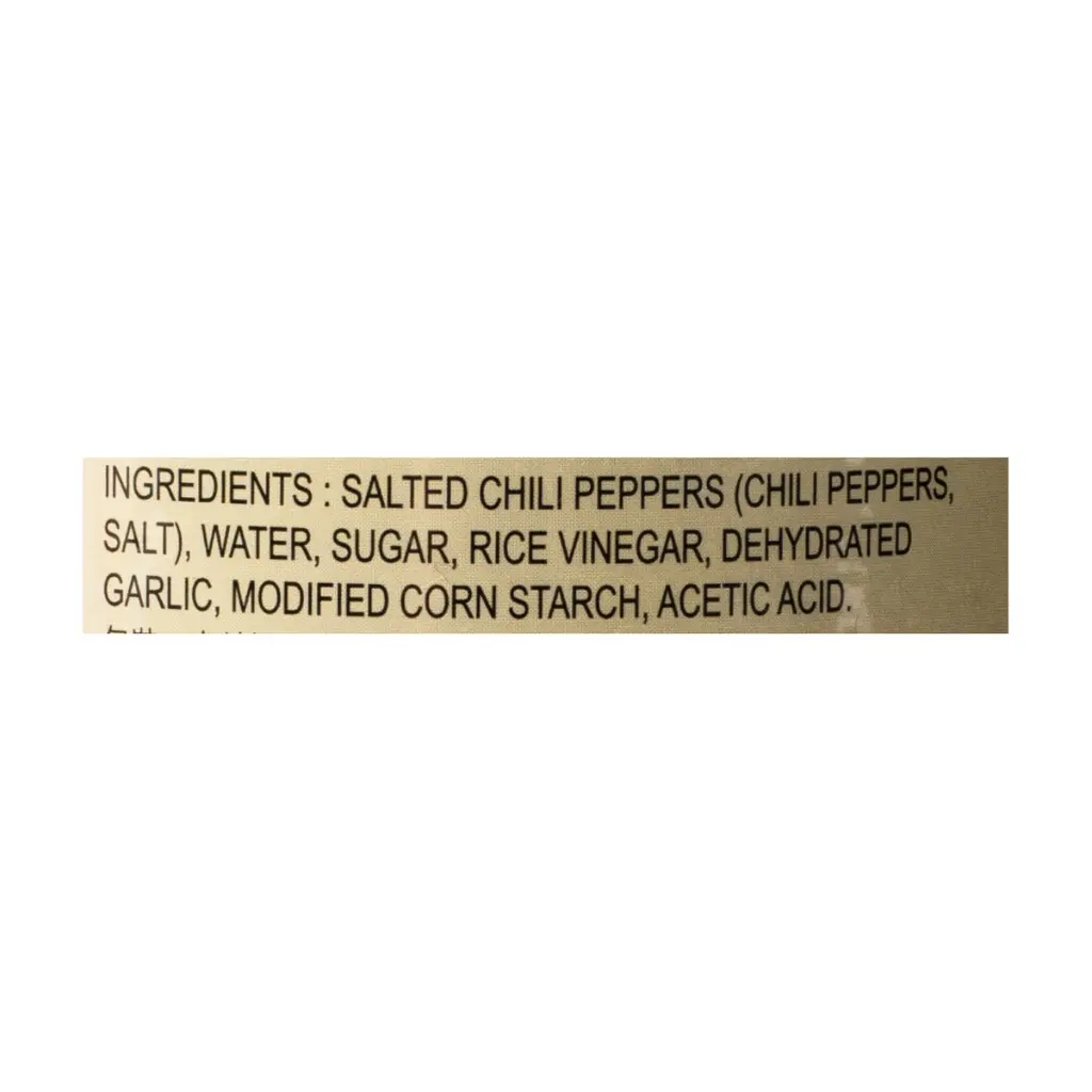 Ingredientsacetic acid, chili peppers, dehydrated garlic, modified corn starch, rice vinegar, salt, sugar, water