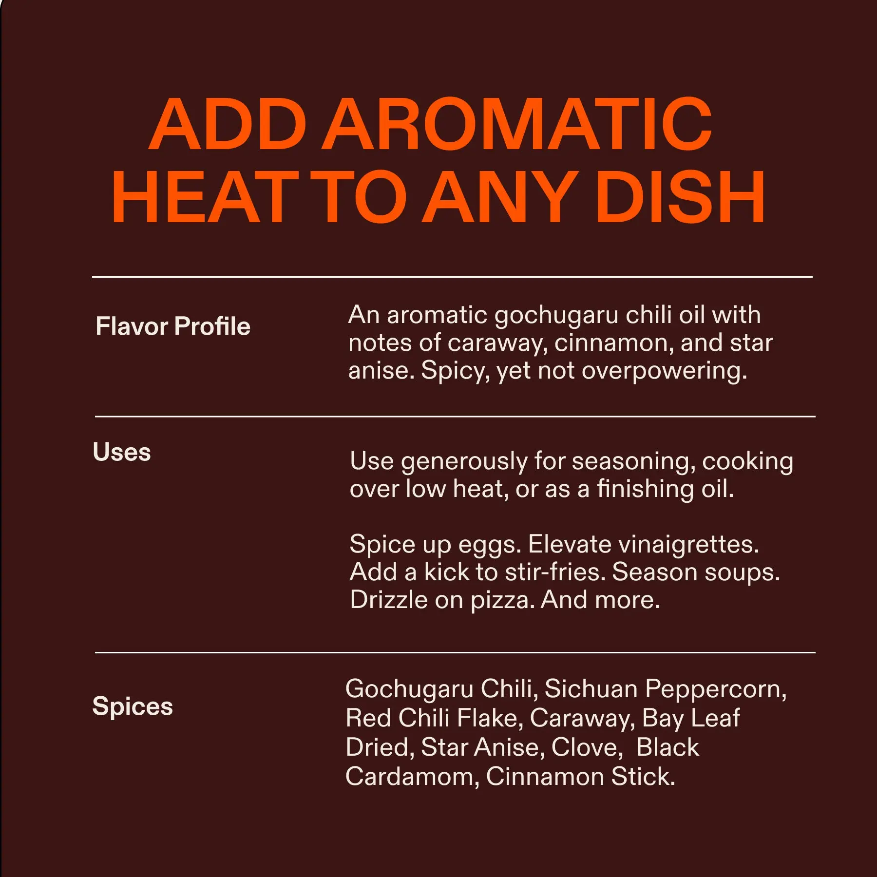 Ingredients: Algae Oil, Gochugaru Chili, Sichuan Peppercorn, Red Chili Flake, Caraway, Bay Leaf, Star Anise, Clove, Cardamom, Cinnamon, Vitamin E.