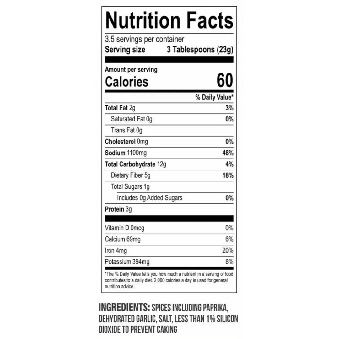 Kent Rollins Chili Seasoning is a 3.8 oz plastic jar, gluten-free with garlic & cheese flavor. Perfect for Mexican & chicken recipes. Ingredients include spices (paprika, dehydrated garlic, salt, less than 1% silicon dioxide). No MSG.