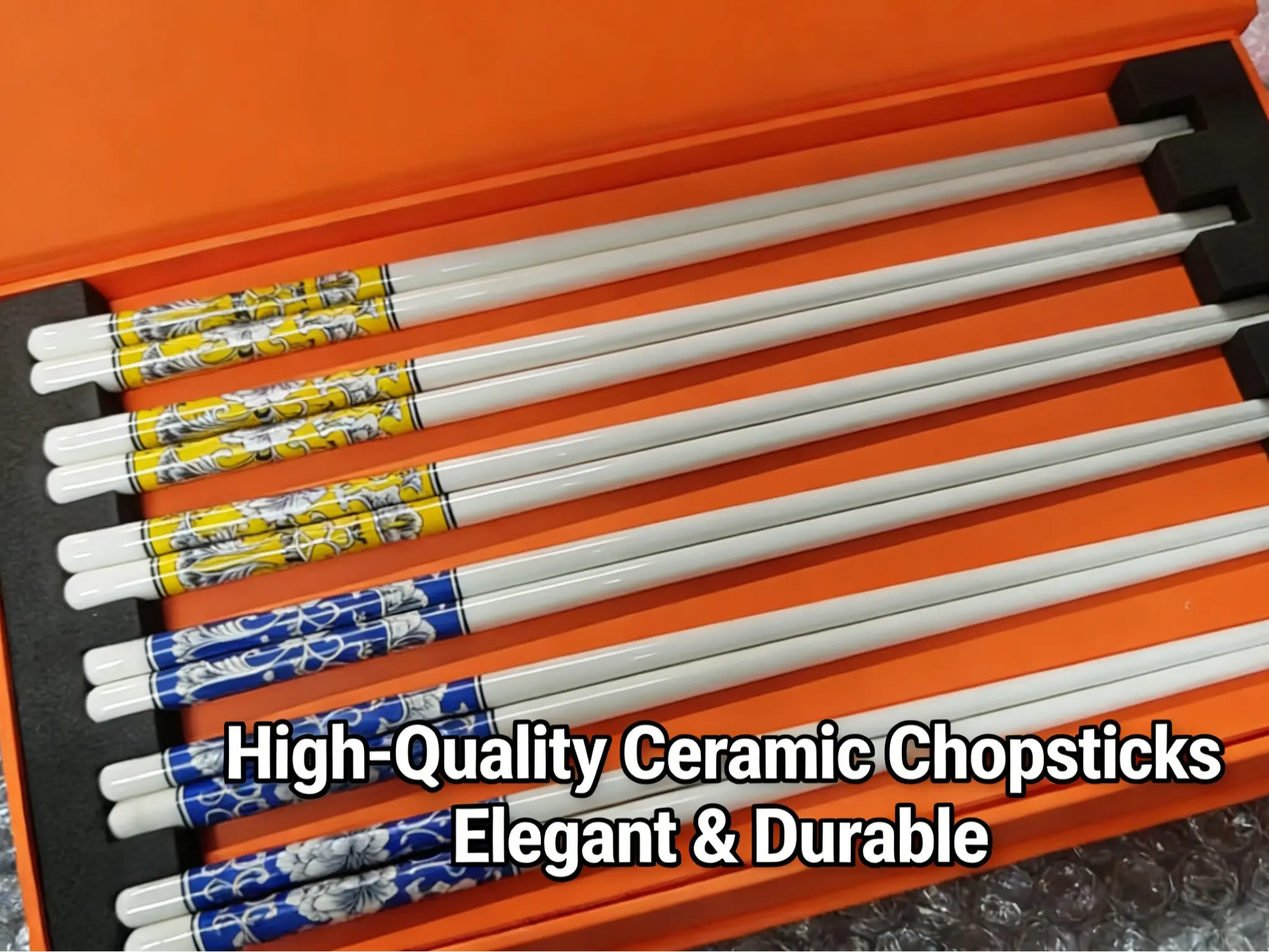 Each pair is made from high-density ceramic, with a finely polished surface that feels smooth and gentle to the touch, offering excellent anti-slip performance when picking up food. The ceramic material is naturally mold-resistant and antibacterial, eliminating the need for frequent replacements. Simply wipe them dry after cleaning to keep them spotless, making them more durable and hygienic than wooden or bamboo chopsticks. The 6-pair set is ideal for family dinners or gatherings with friends, and the contrasting yellow and indigo colors add a vibrant Chinese-inspired atmosphere to your table. Whether paired with Chinese home-cooked meals, Japanese sushi, or Western light dishes, they will instantly elevate your dining experience.